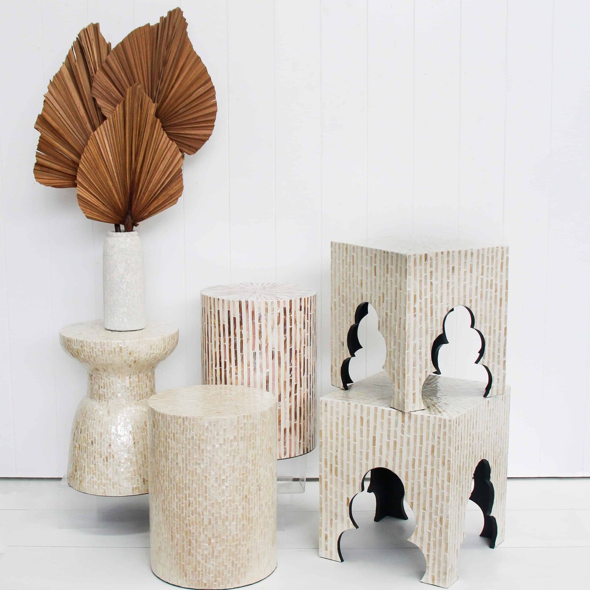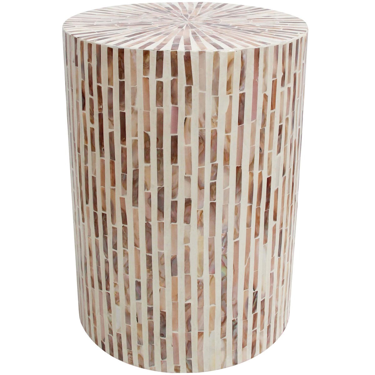 Hand made through the use of top quality medium density fibreboard material in a cylindrical, vertically inclined dimension, it is then beautifully ornamented with the use of naturally enchanting capiz. The cylindrical tall frame ends in a spherical surface and base which is why this chic piece of furniture has versatile functionality. It is therefore functional for use as a table in various locations of various spatial environments. It can be used as a side table in the living room, it can be used as a bedside table in the bedroom, it can be placed beside the living room and bedroom console, and in so many other ways.