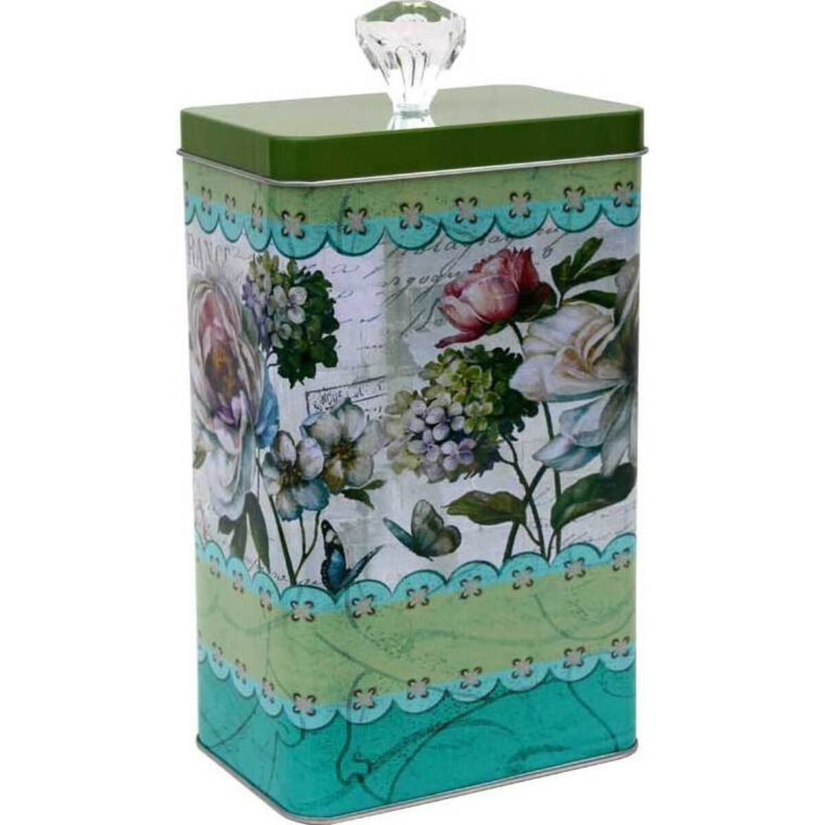 Our Teal Rose Storage Tin is certainly one to collect. It has the look of perfumery or cosmetics casings from the 19th century, with all the subdued hues, lace, and flowers that went along with graphic posters, art, and packaging from that period. • The tall rectangular tin has a well fitting lid in dark loden green with a faux glass knob that harkens back to the glass doorknobs found on old houses. • A pale grey background has large flowers and butterflies in pinks, blues, greens, and lilac over a text graphic. • The bottom portion is done in brilliant aqua blue, and a lace overlay at the middle and top is green and blue with a scalloped border and pink repeating floral inset.
