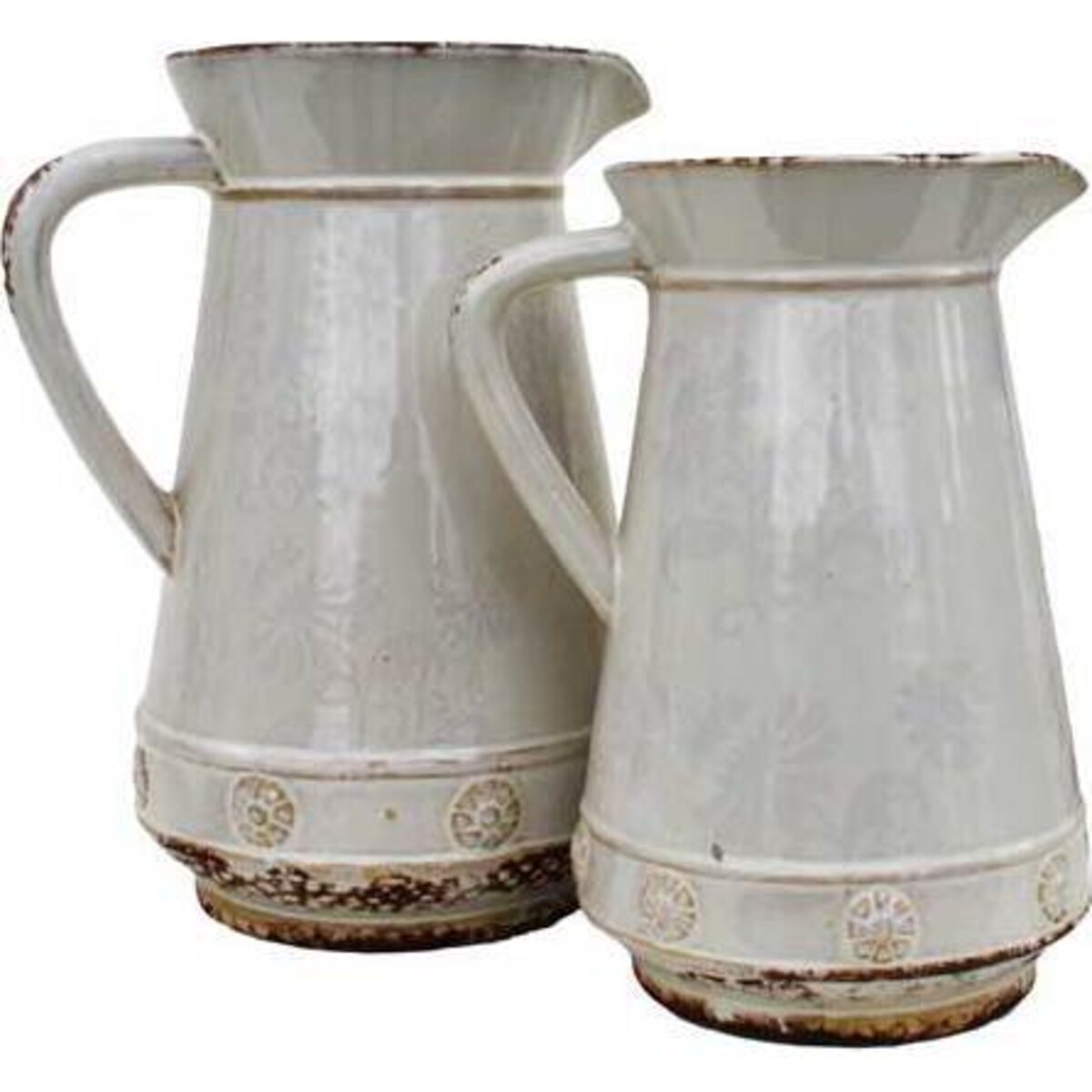 This white jug features a floral print and brown detailing along the top, base, and handle. The spout is pointed to allow for easy pouring, and the handle makes maneuvering the jug a breeze. These jugs are large enough to hold a good amount of liquid, while not being so large that they're going to be cumbersome to store in the fridge. In addition to their additional purpose, they're so lovely you can also use them in a variety of ways, such as a vase for short, oversized bouquets. Thanks to their colouring and design, they're ideal to use in a variety of settings and occasions.