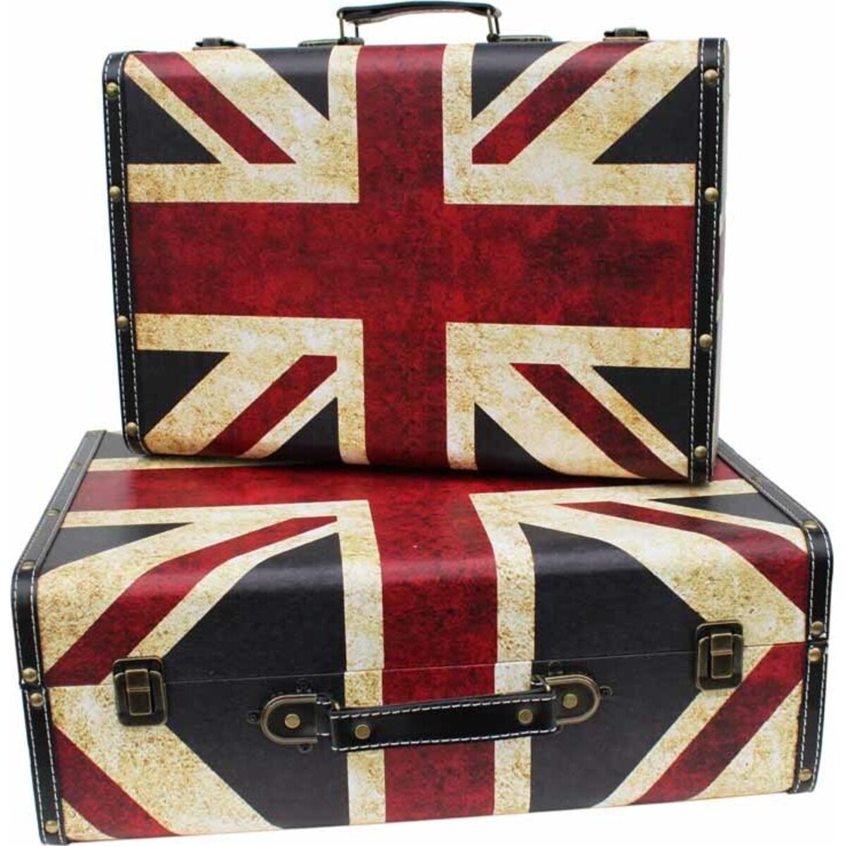 The suitcase features the red, white and royal blue British flag and has a slightly worn and weathered appearance that only enhances its beauty. Rounded and reinforced edges protect the item from bumps and scratches while a reinforced handle ensures a sturdy product. Two luggage locks keep the piece closed tightly. This box is wonderful to use while traveling but would make an even better display and organizational piece. Ideal for those who love the UK or travel, the suitcase is large enough to store a variety of items without taking up too much space wherever it's kept. It's stylish and certainly something worthy of being displayed and not kept in a closet. Everyone will want one for their very own whether they use it for business or pleasure.