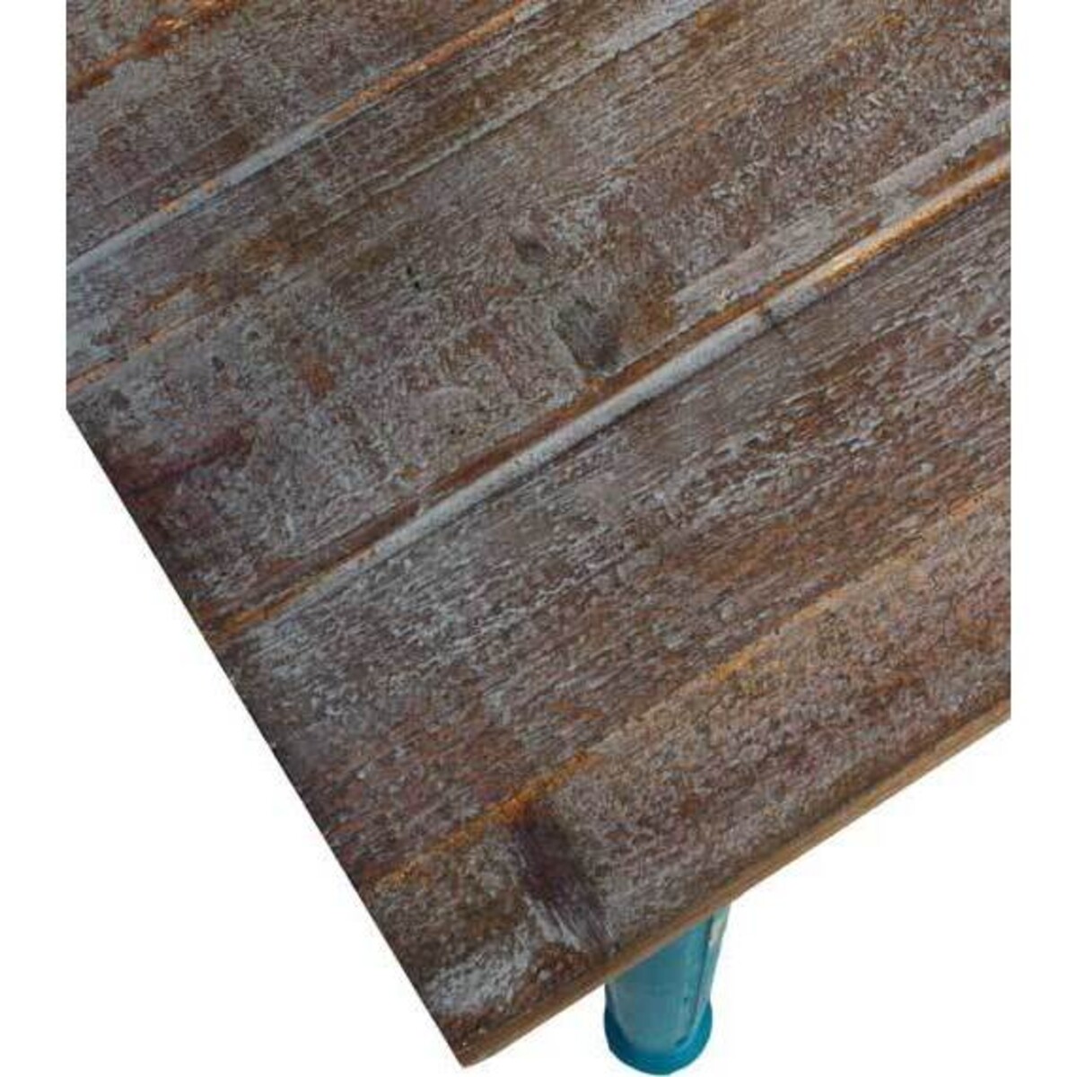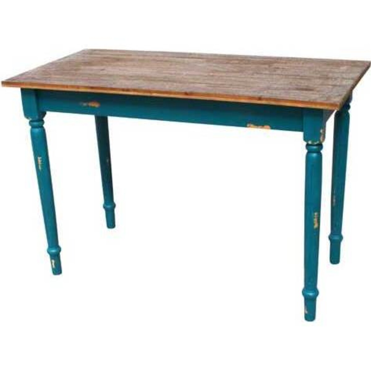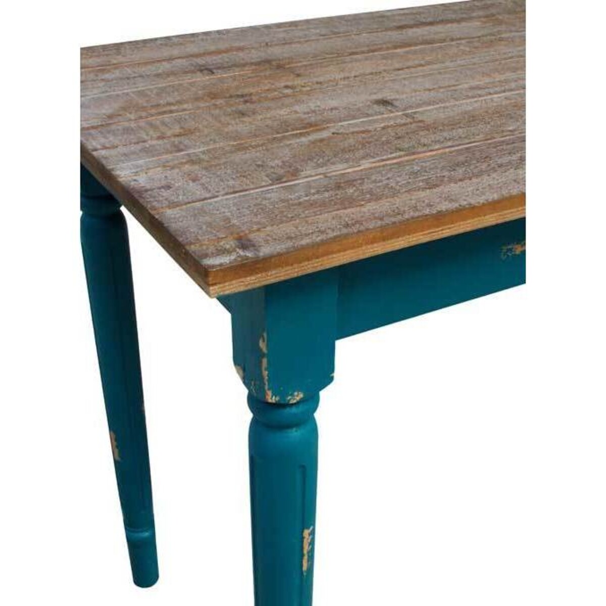 This table features a blue base and carved legs with a weathered plain wood tabletop. The entire piece is worn to give it a well-loved and vintage feel. This table would work well into almost any room, especially those that are decorated in a country or coastal style. Whether you use this table on a daily basis or only whip it out for parties, it's sure to be one of your favourite pieces in your home.