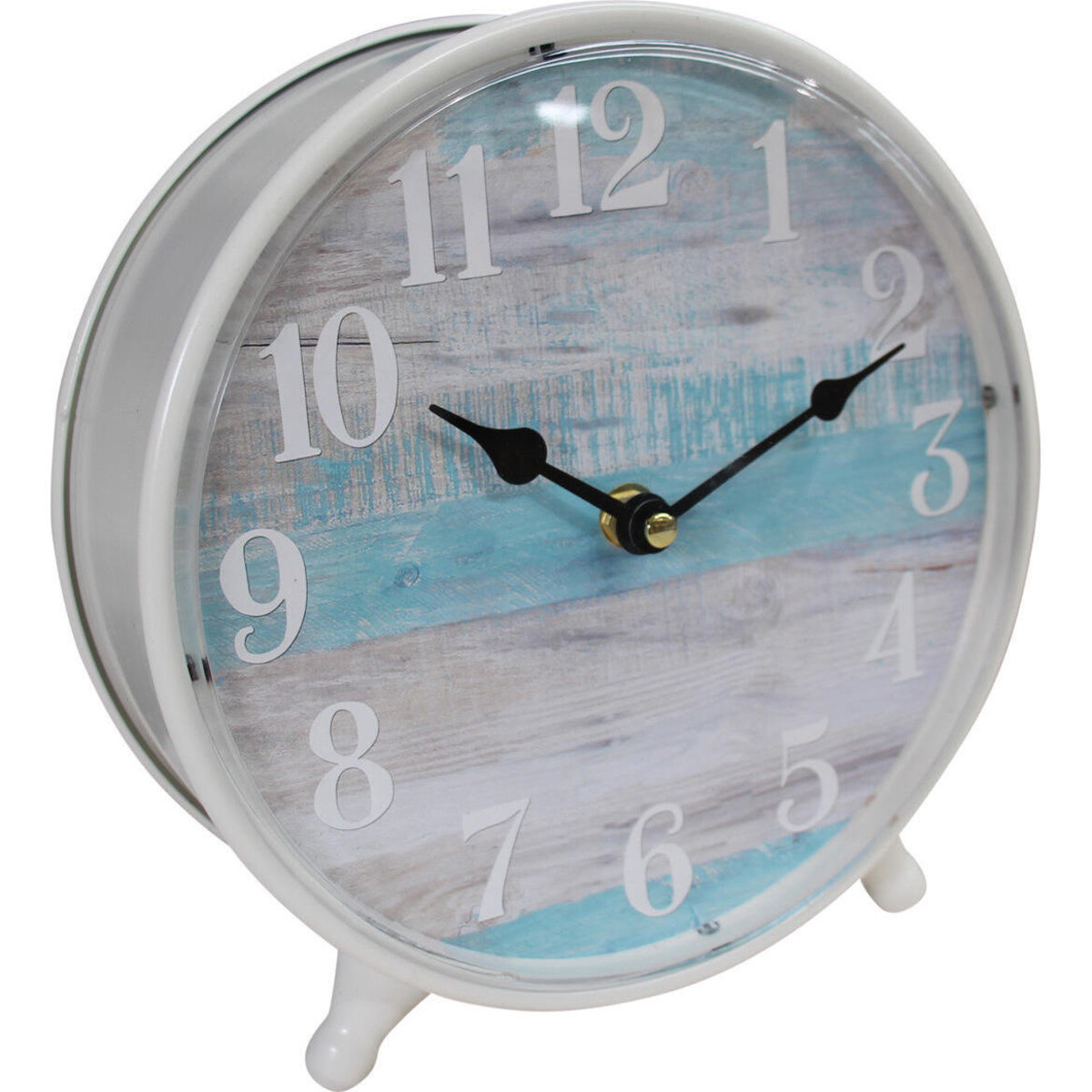 This elegant, nautical-inspired soft blue/white table clock adds a touch of modern country style to an office or home. Made of MDF, metal and a reflective glass front covering over the dial, this timepiece has a wooden face painted lightly in horizontal strokes of light aqua blue, bold white numerals and metalwork on the circumference with a white rim all around. The digits are clear and visible creating a stylish functional console table clock that accurately helps keep track of passing time and will make a perfect addition to a beachside or nautical themed home decor or complete a coastal ensemble.