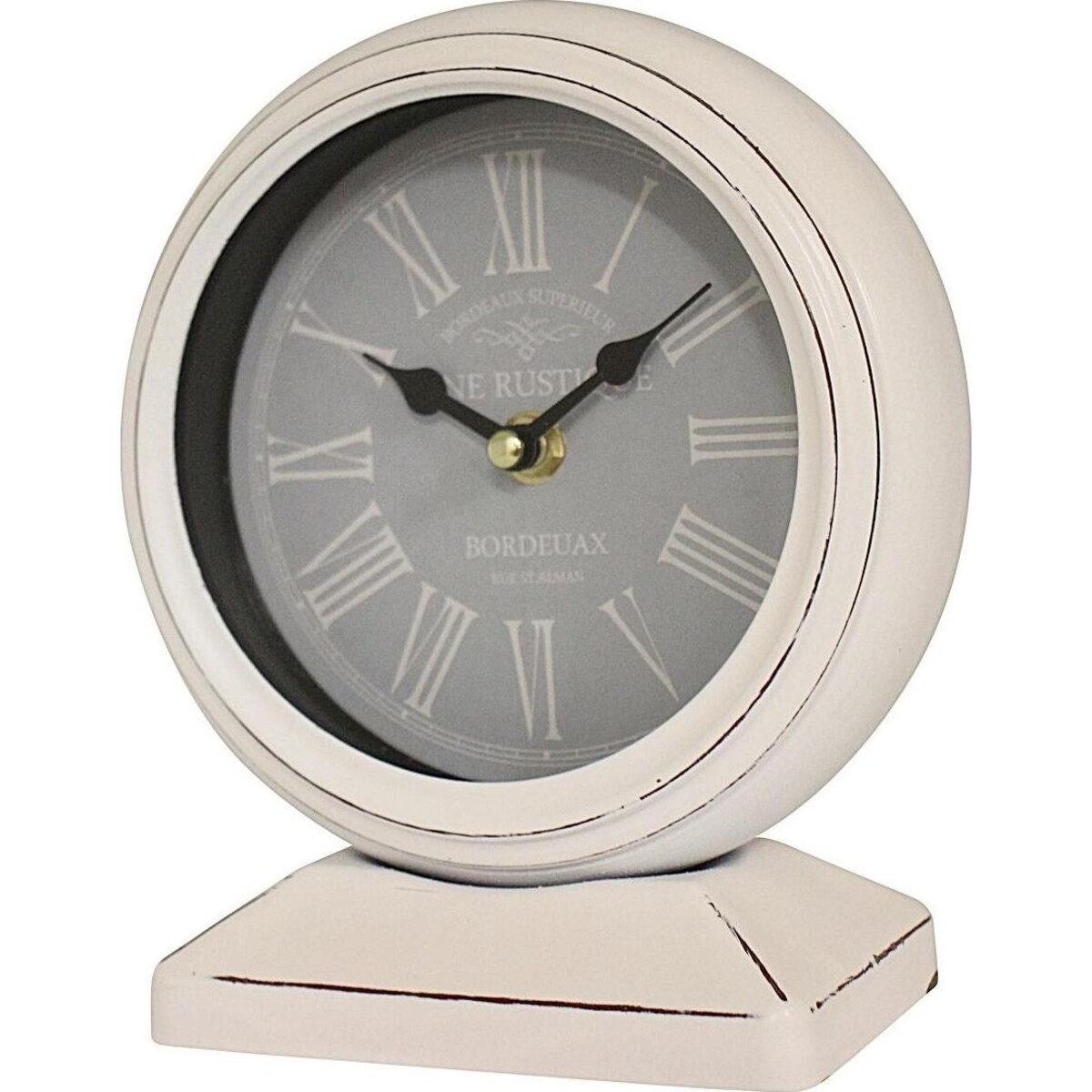 A table clock is not merely functional as it sits there amidst a lot of your vintage heritage paraphernalia and joins them in making the best of the theme. This clock does this and more. Keeping perfect time would be simply one of its most important features. Its other aspects like the rubbed paint along the edges of its robust body - the face that shows off the time so clearly and the dark hands of the clock that could be seen easily from a distance adds to the avid kind of charm. the clock stand so well balanced on its solid base and the very French appeal of its grey and white colours makes it seem all the more vintage heritage. The words oriented on the face like Bordeaux adds to its heritage charm. Add those other antique highlights along with tis mantle top or shelf top clock and you will feel the look of heritage theme come right through in your spaces. Will keep accurate time and showcase your love for things vintage with its presence.