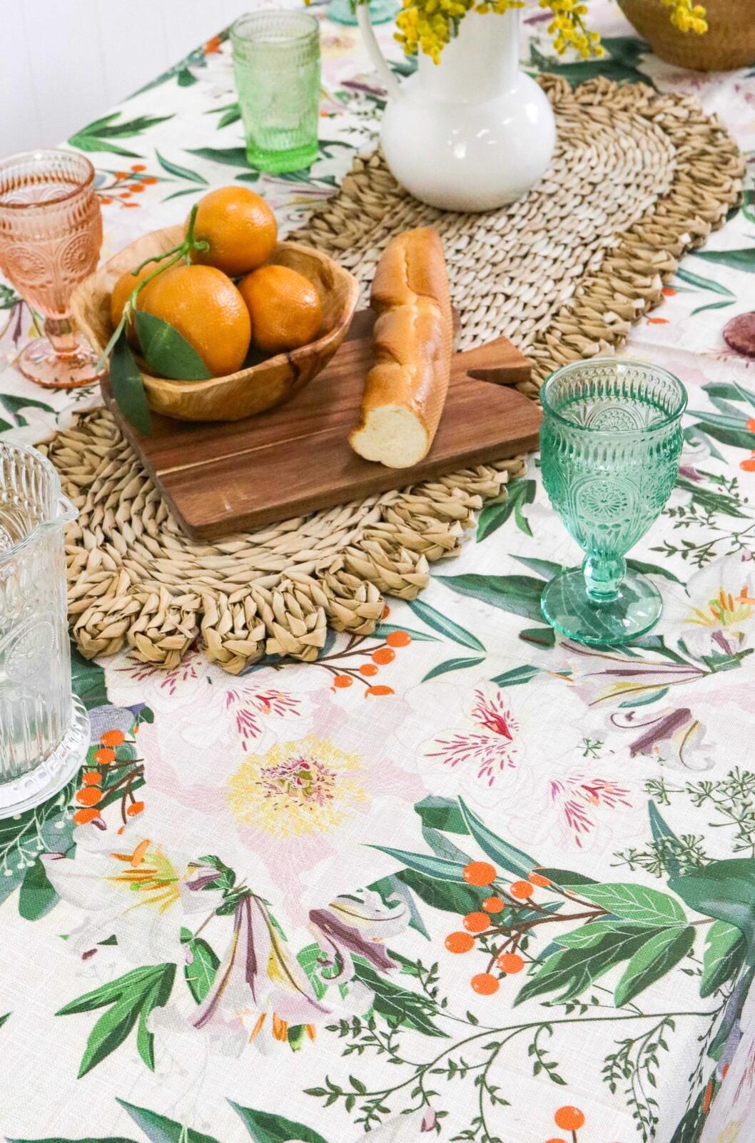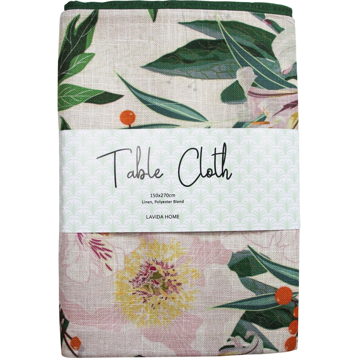 The start of a great table setting comes from the bare canvas of the table cloth and in this case the bare canvas truly is a masterpiece in itself-all you need are some seagrass woven placemats and plain solid coloured runner to complete the look its going to create. A fabulous accessory for your home -the fabric wears a rich texture because of the blend of fine quality linen and polyester that has been used in creating this piece. A neat stitched edging adds to its classic elegant look. Myriad blooms and foliage makes up the print whose base colour is off white making it easier fort you to tie it in with your usual crockery.