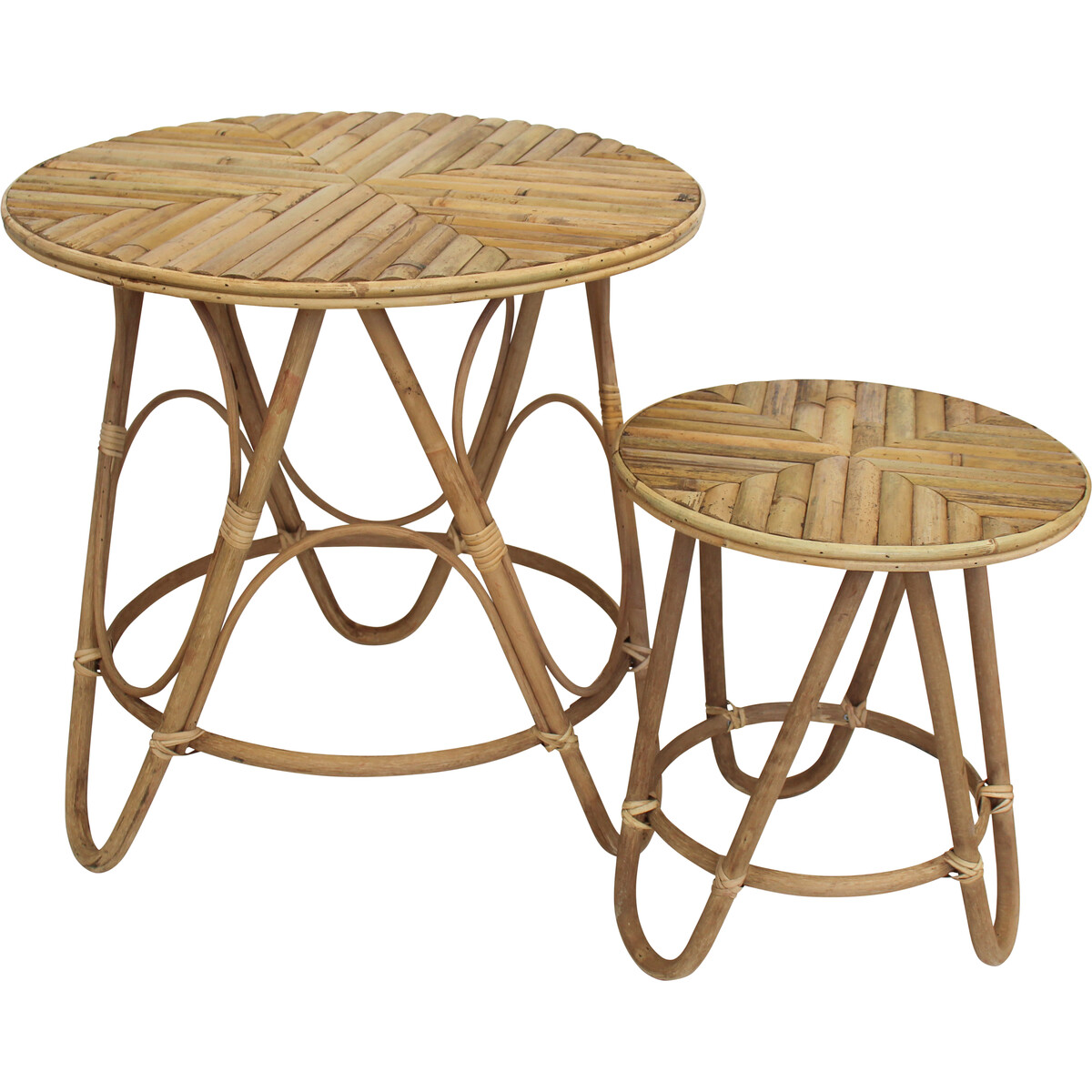 The gorgeous Coral sculpture you picked up on the last trip to the seaside, the lamp with fascinating shade and your gorgeous flowering orchid- all of them need the support of a table, for them to be displayed the way they should be. And what could be better than simple tables to give them that advantage. Here is a set with two tables that vary in height, have a round solid top crafted from pieces of rattan- and show off their traditional chic design to the optimum. Invite a whole new look to your spaces with this natural and minimalist design flaunted by these two little tables. The round top is neatly finished and the lower body of the table with loop-shaped slanting legs, adds to its solidity and balance. A must-have for any home to allow you the flexibility of decor, or when you wish to sit out and need that all-important prop to hold up your coffee mug.
