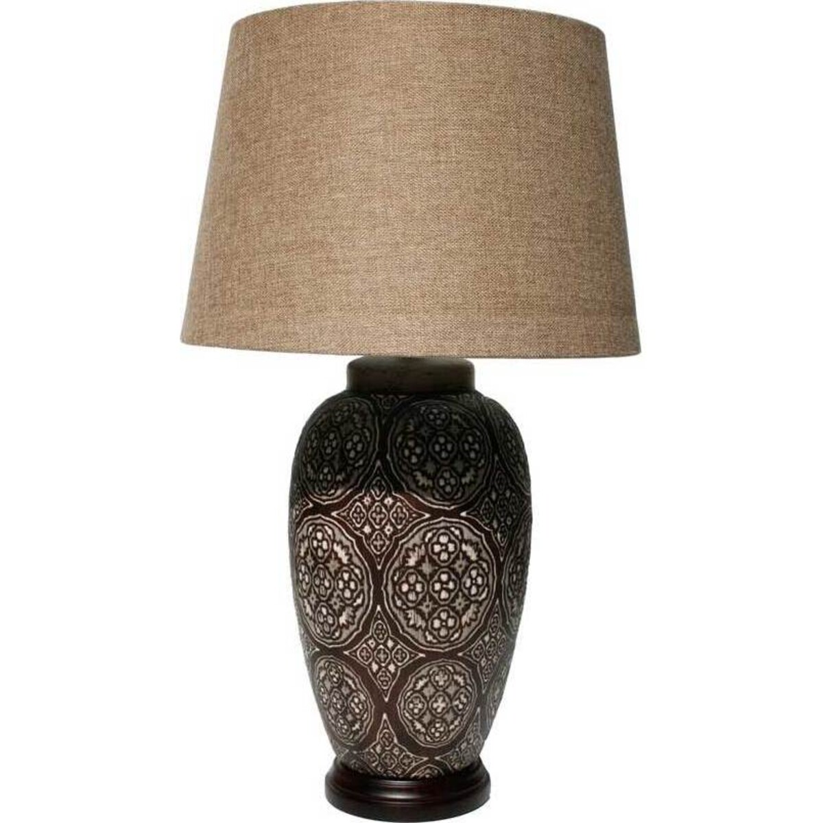 This beautiful brown and white patterned lamp has the look of an intricately painted wooden piece. It is painted in a style that is reminiscent of Persian rugs and will be a key piece in any neutrally painted or decorated home. This lamp may be initially perceived as a somewhat sombre piece; however, the strong and dignified decoration of the lamp will add warmth and light to any space. The lampshade is a coarsely woven canvas that adds to the earthy appeal of this lamp. All in all this lamp has a simplistic yet impressive design throughout that can really add character to a naturally decorated room. Ideal for use in living rooms, dining rooms, study rooms and bedrooms, this lamp could easily be paired up with chocolate brown leather and dark flooring for a simple yet stunning looking room. The lamp has a deep dark wooden based the compliments the overall design.