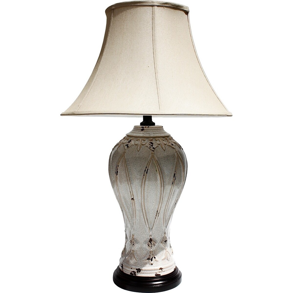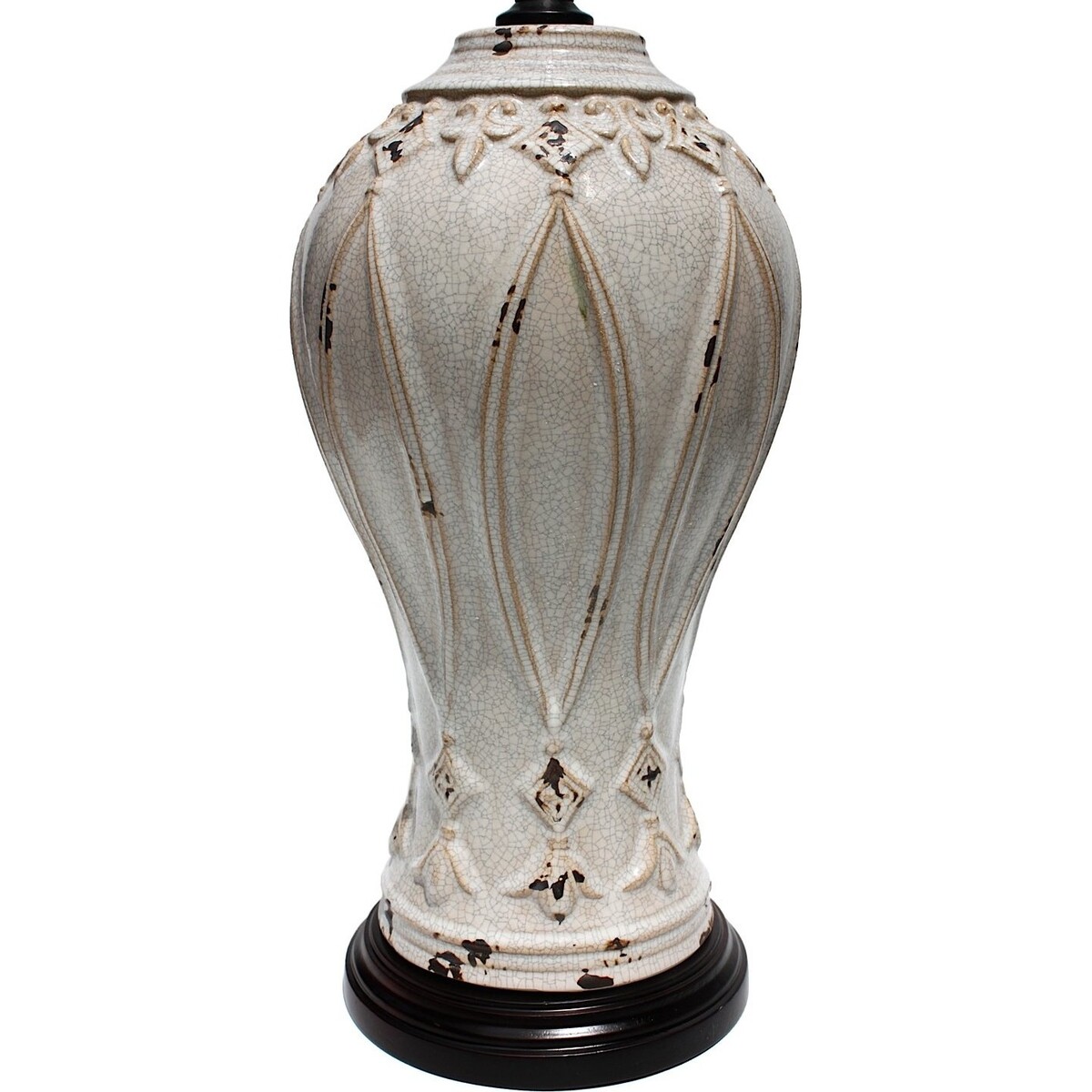 The Crackle Loop table lamp curves upwards in the shape of a tall and narrow apple. It is a cream colour that has been faded to give it a crackled look of age. This includes the weathered vein effect normally present in antique paintings. It is decorated with a pattern of fleurs de lis and florettes that add to the curvaceous structure. The base of the lamp and the light fixture are a solid black colour that contrasts nicely with the rest of the light. This product comes with its own lamp shade in perfect proportion to the rest of the table lamp. It is a plain white shade that arches downwards to complement the shape of the lamp itself. The neutral colour scheme of this lamp will work well in many settings.