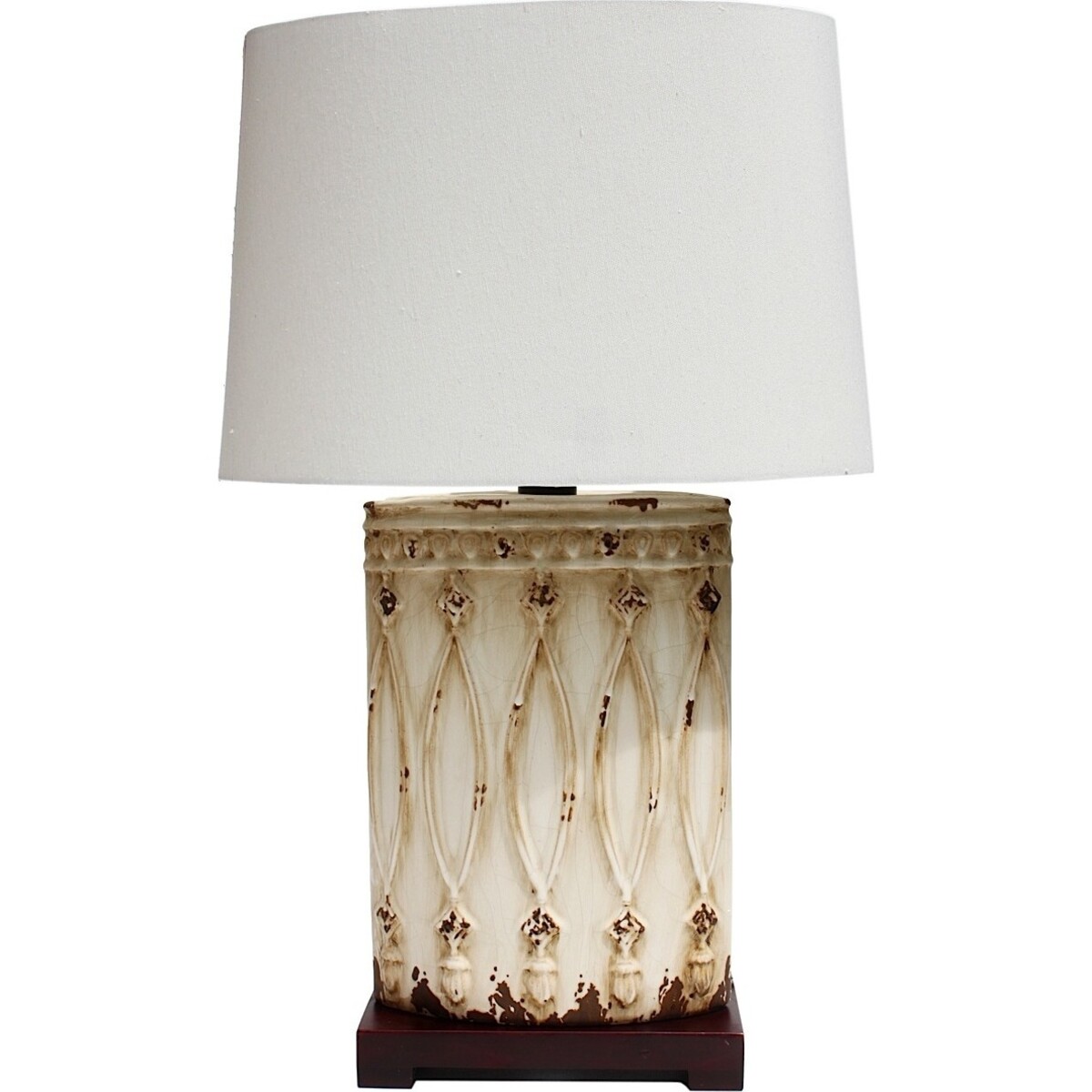 The Crackle Motif table lamp is a cylindrical shape that goes straight up and down. It is a cream colour that has been faded to give it the weathered vein effect normally present in antique paintings. The base of the lamp and the light fixture are a solid black colour that contrasts nicely with the rest of the light. This product comes with its own lamp shade in perfect proportion to the rest of the table lamp. It is a plain white shade of a basic shape that complements the shape of the lamp itself. The neutral colour scheme of this lamp will work well in many settings. And the tube like shape is less showy than a more curvaceous table lamp. Lighten your home and your heart with the Crackle Motif table lamp.