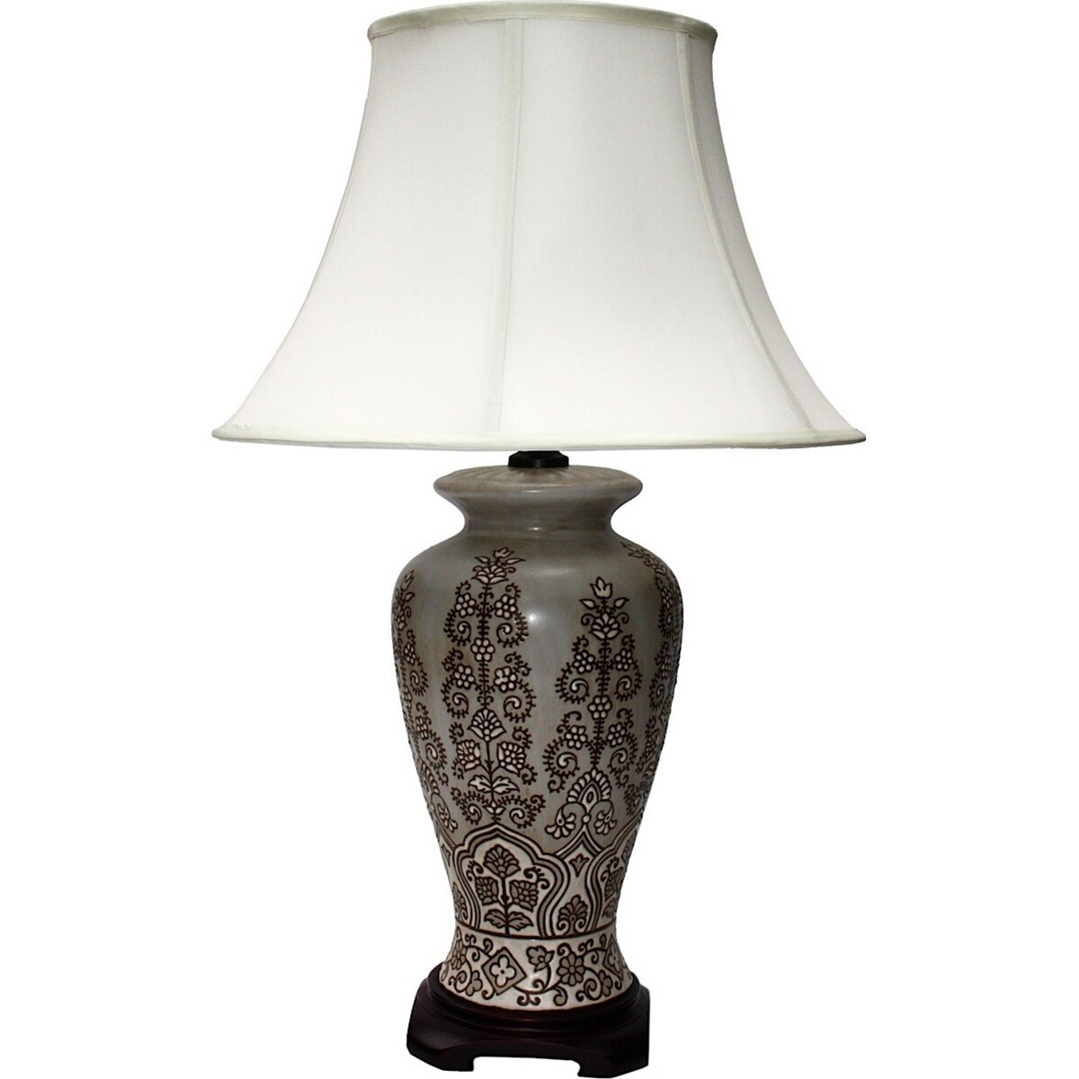 The tall Grey Decal table lamp is decorated with a pattern of intricate vine work that has an elegant and far Eastern appeal.