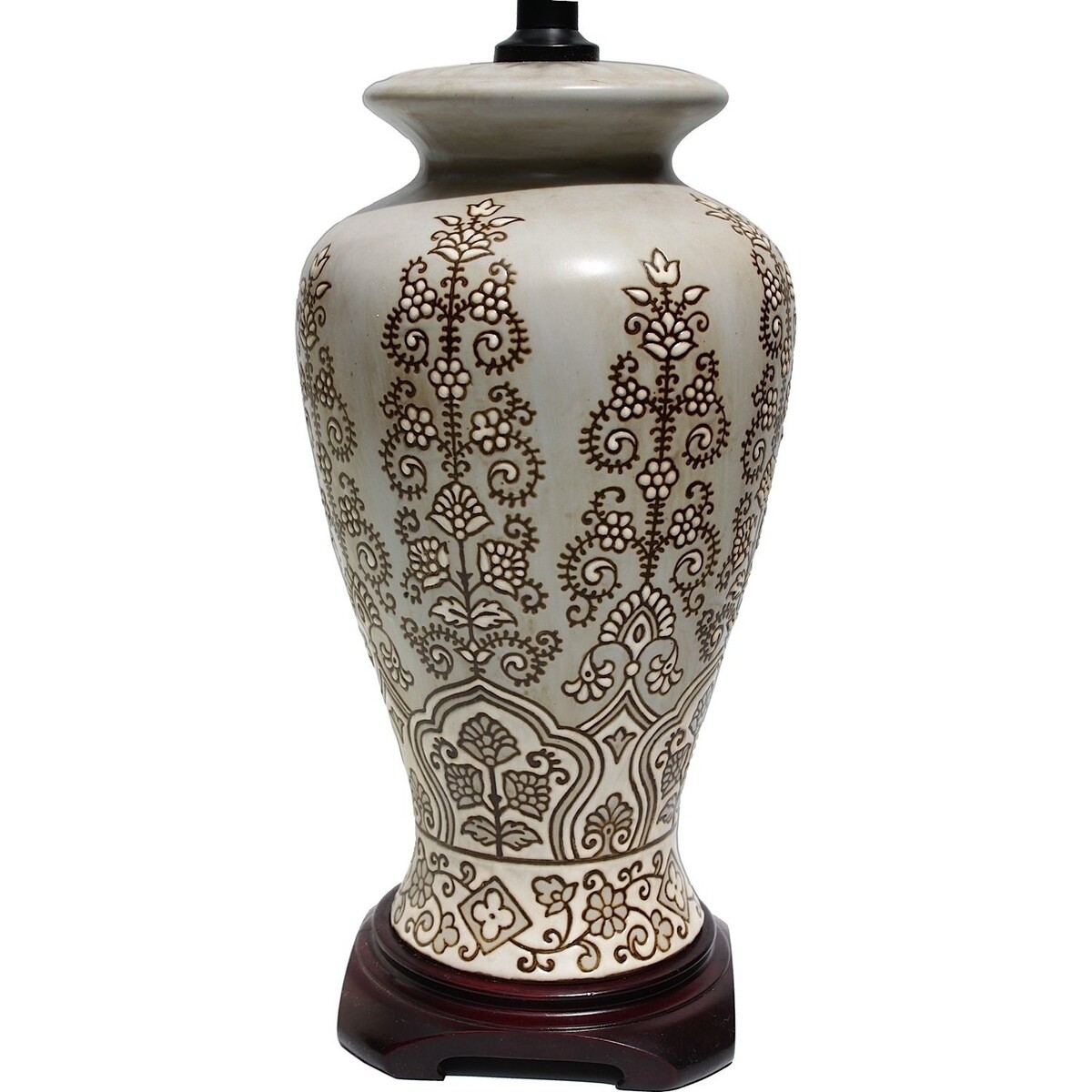 The Grey Decal table lamp is covered in the patterns often seen in henna tattoos. From the bottom up this lamp starts off with a four legged base that is a dark colour reminiscent of teak wood. Rising we see that the pattern begins by moving horizontally around the bottom of the lamp in a flourish of rosettes and vinery. At a certain point the pattern thrusts upwards across the line into a paisley structure that surrounds an intricately drawn set of flowers. From the tip of the arched structures vines grow tall to the upper area of the table lamp, where the structure curves up and under the shade. The lamp shade is white and complements the shape of the Grey Decal table lamp quite well.