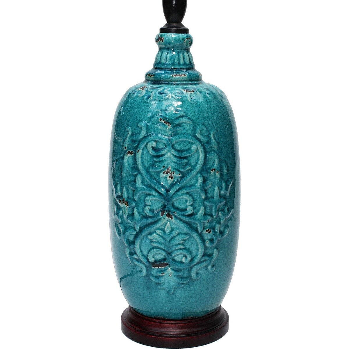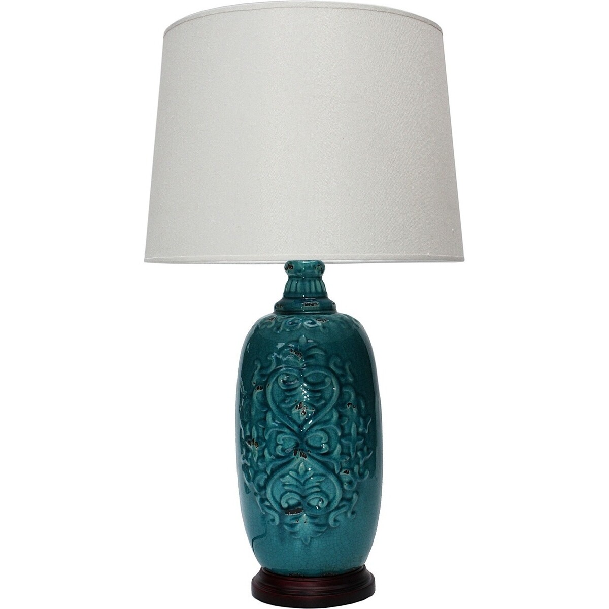 With its exquisite design details set on a turquoise theme and topped with a silken, "neutral" shade that enhances the overall feel rather than subtract from it, this Table Lamp (Turquoise Motif - Lighting and Shades section) is not only a safe lighting option, but it is also one that exudes a certain character. When turned on, its delightful glow not only lights up the room, but lights it up warmly. Needless to say, this Table Lamp adds just a touch of elegance and originality to any living space. Use it to spice up your interiors or as a focal point (or part of your focal point). Anyhow you deem it to fit your decorative aspirations, this Table Lamp delivers its own distinct magic.