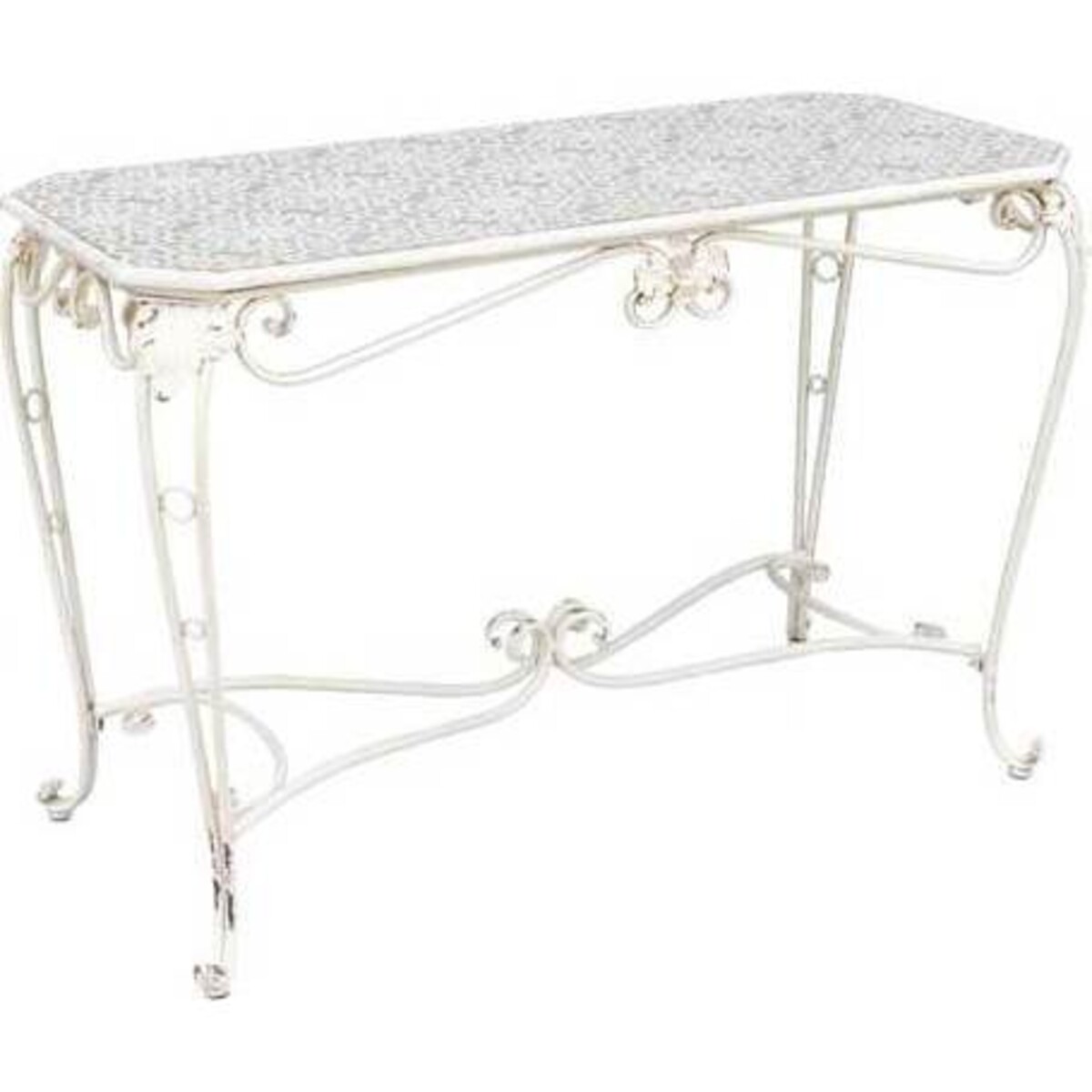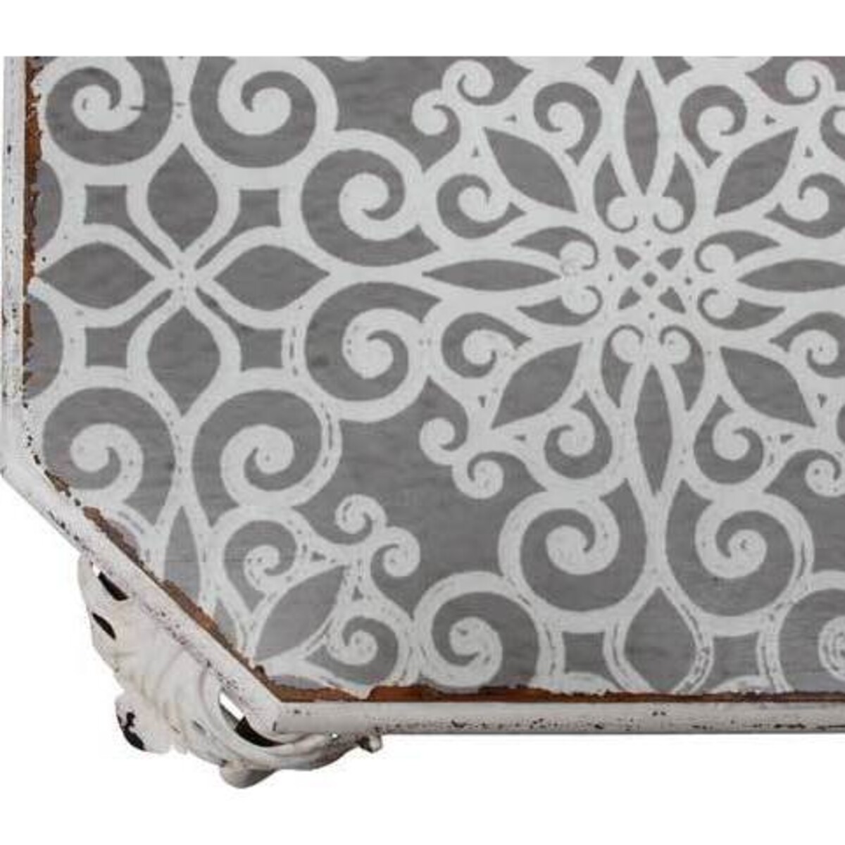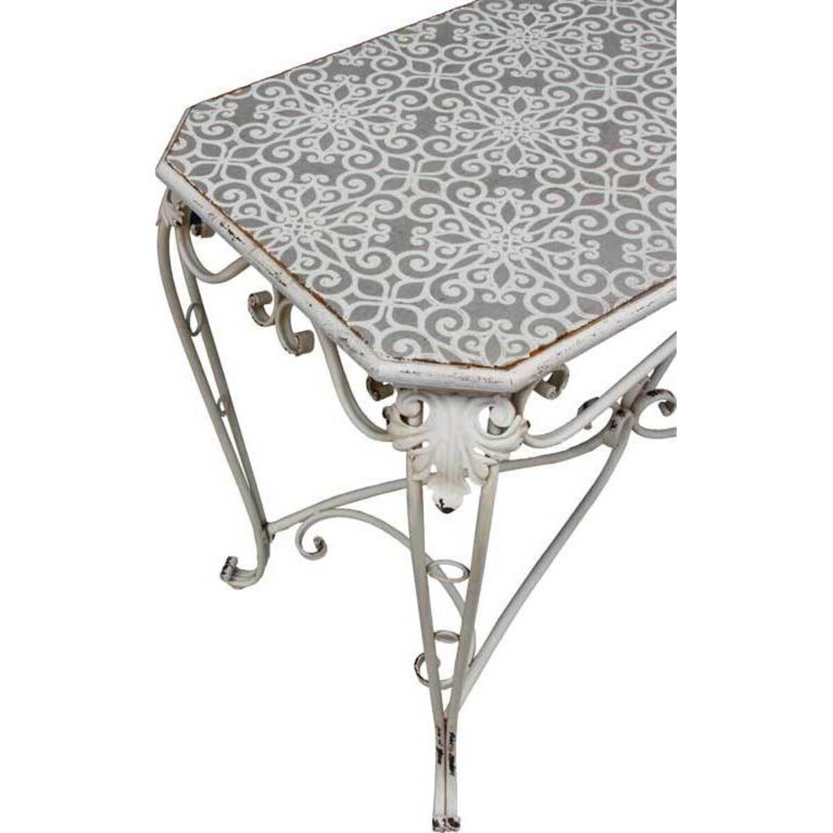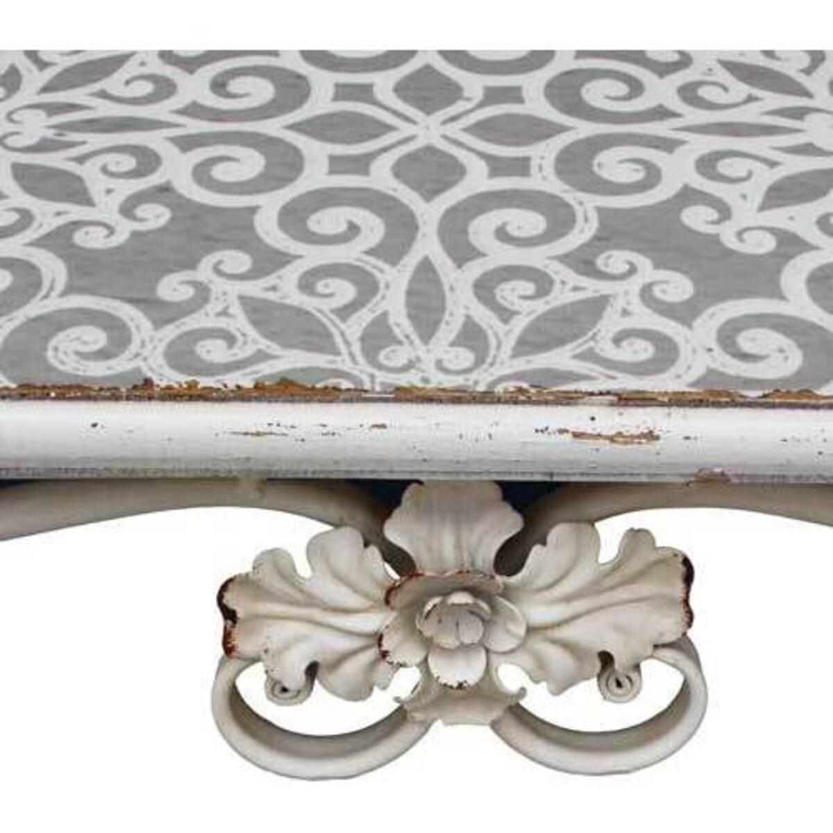 These white metal tables feature a grey top with a white swirled design covering the surface. The legs consist of a fabulous scrolled design with a fleur de lis design at either corner. The edges of the table are slightly worn to give them a look as if they've been loved and well - used for several years. While they're ideal to use in your home on a daily basis, they're also perfect to use for special occasions when you have guests over. The tables make for a stylish option to hold food, drinks, and gifts for all those who come to your home.