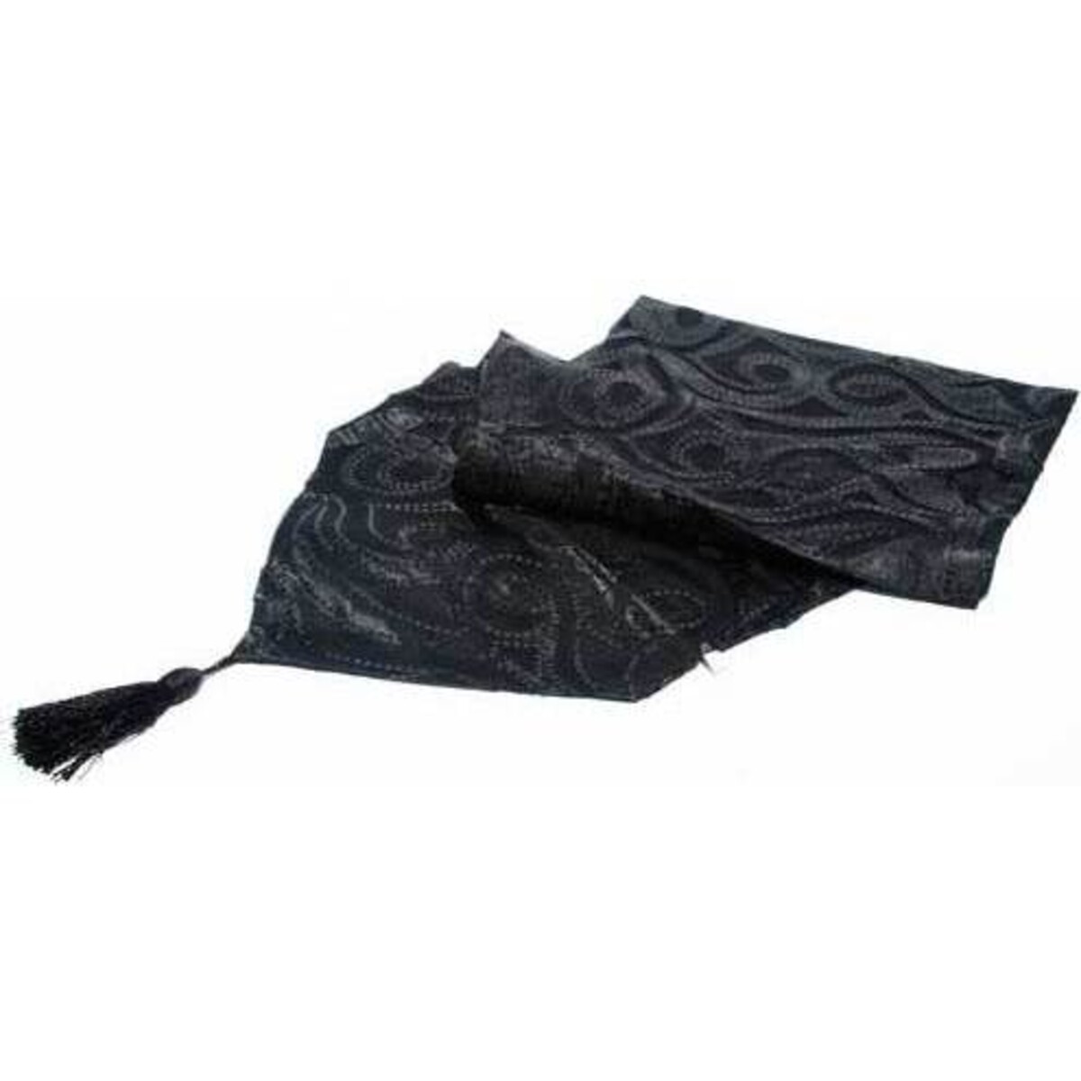 Introducing the Black Applika Table Runner. It has a chic swirled design woven throughout and tassels on either end so it has all the elegance and charm you could want without it being dreary. The best part is that it can complement any other colour d_cor you pair it with whether it's silver or vibrant hot pink. Its luxurious design may appear to be expensive and it will certainly have everyone talking, but only you'll know how little it actually cost you. And who said style had to cost a fortune?