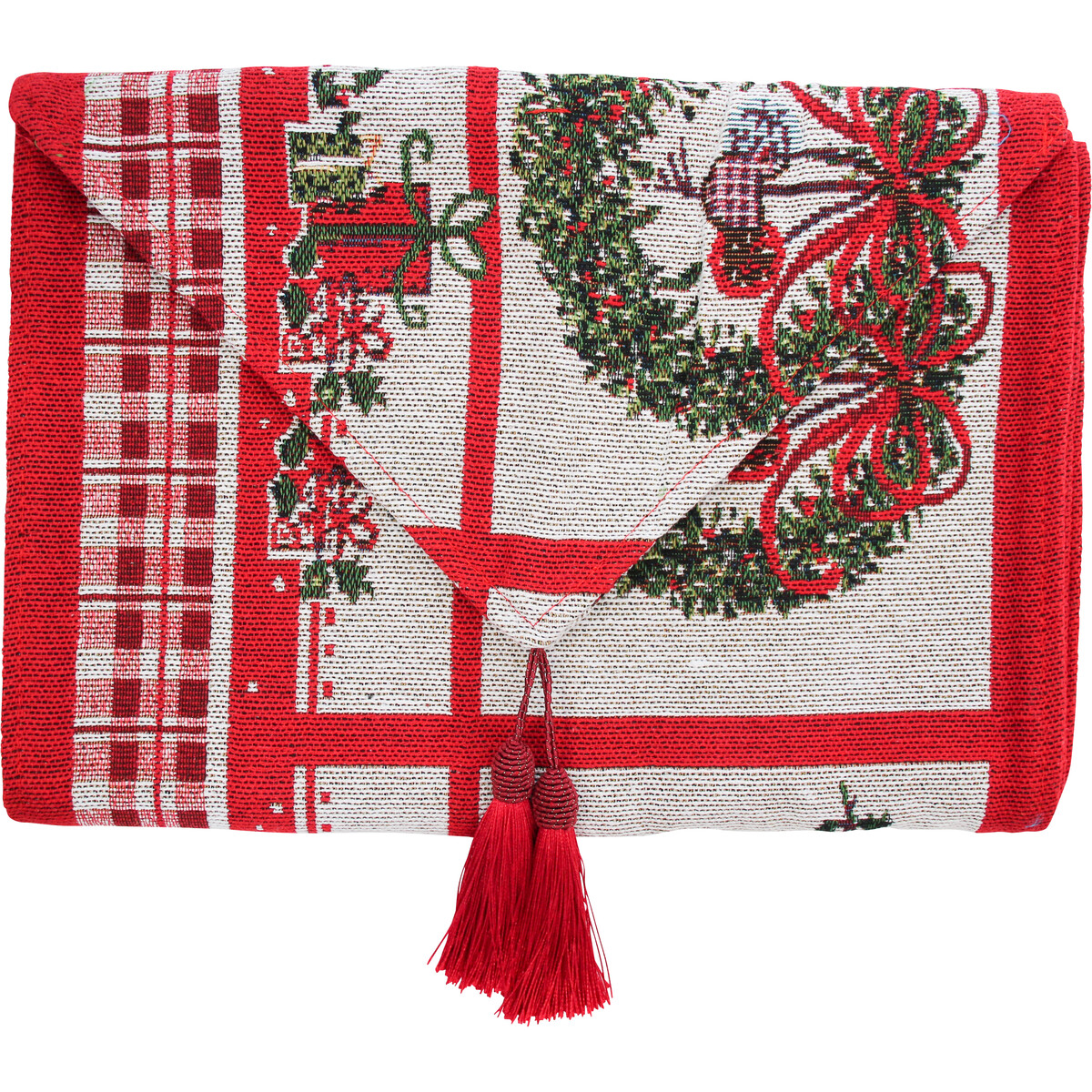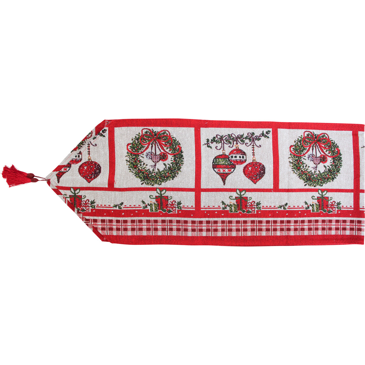 Table runners help bring a great deal of centring to your display on the main table. In fact, it helps combine not just colours but also so the theme- be it through its colour itself or its motifs- and here the theme is obviously that of the festive season. You have on the tapestry, intermingling of gifts, Christmas tree, baubles, ribbons and tassels- and all of it in red and white. A perfect pick if you are wanting to give the right kind of impetus to your festive look table. At some candles, maybe a floral display and you could have the most stunning of looks. Will combine fabulously with table mats in white or red. The gorgeous looking tassel in red at the two ends gives it a wonderful finish.