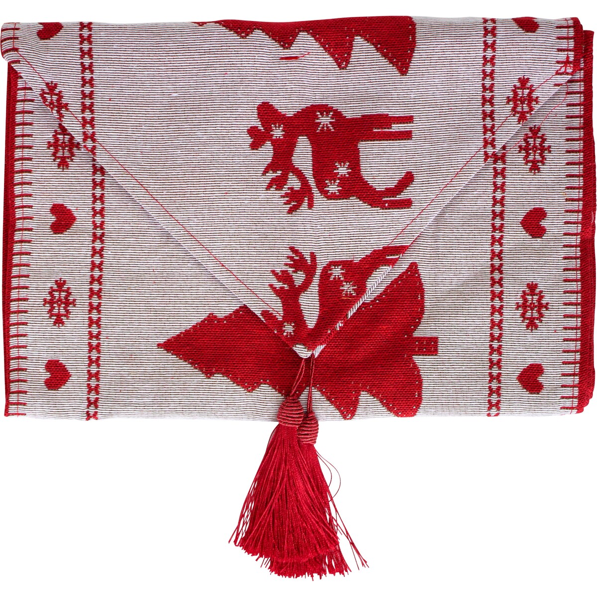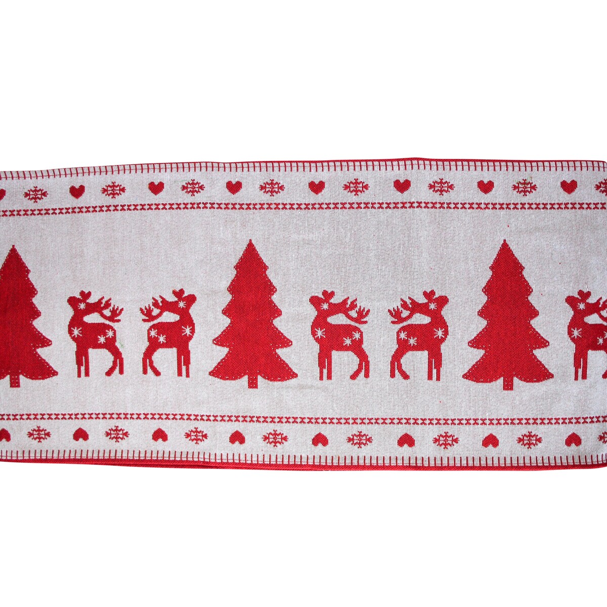 There are several traditionally recognised symbolic elements often incorporated into Christmas decoration. These include things like Christmas trees, reindeers, snowflakes, stars, angels, bells, and several other symbolically significant things. It is therefore a delightful thing that this Table Runner Christmas Row is made in a design which incorporates four elements of Christmas décor into its design. The first is its choice of red and white palette, the second is its weaving of snowflakes, the third is the depiction of reindeers, and the fourth being the image of Christmas trees printed on this table runner.