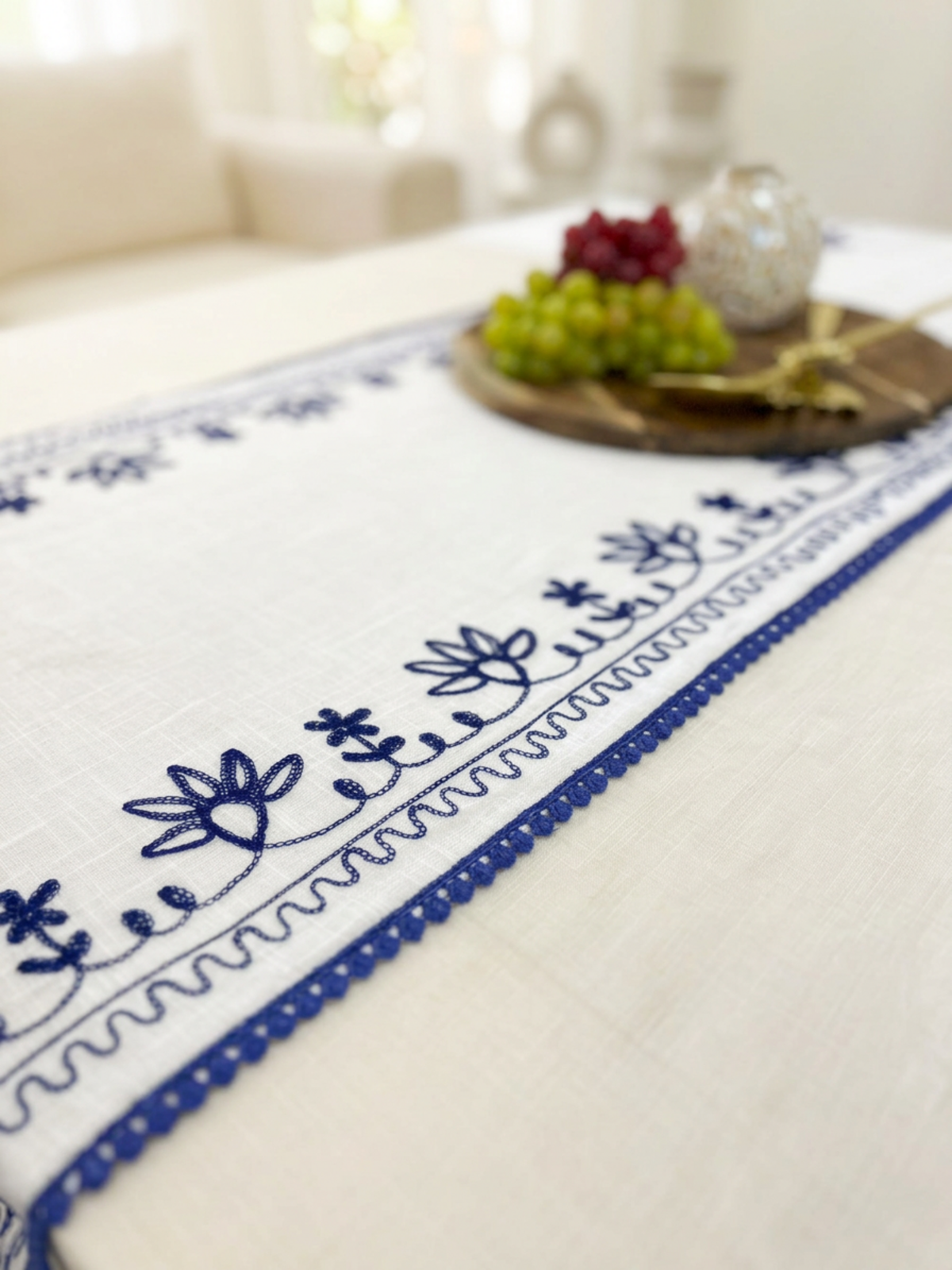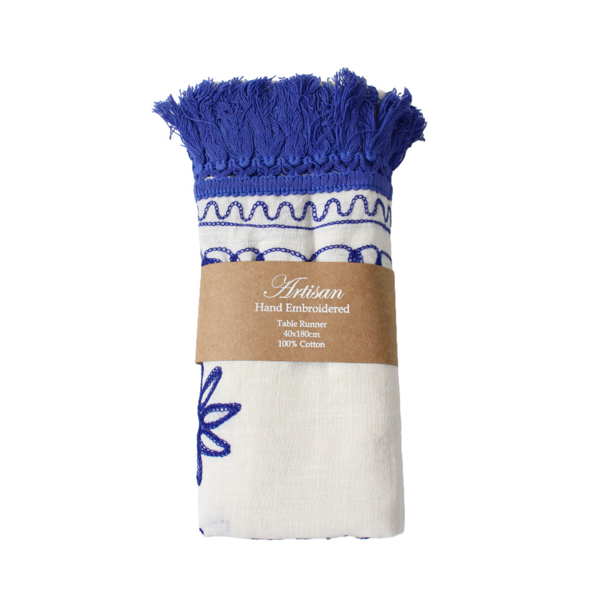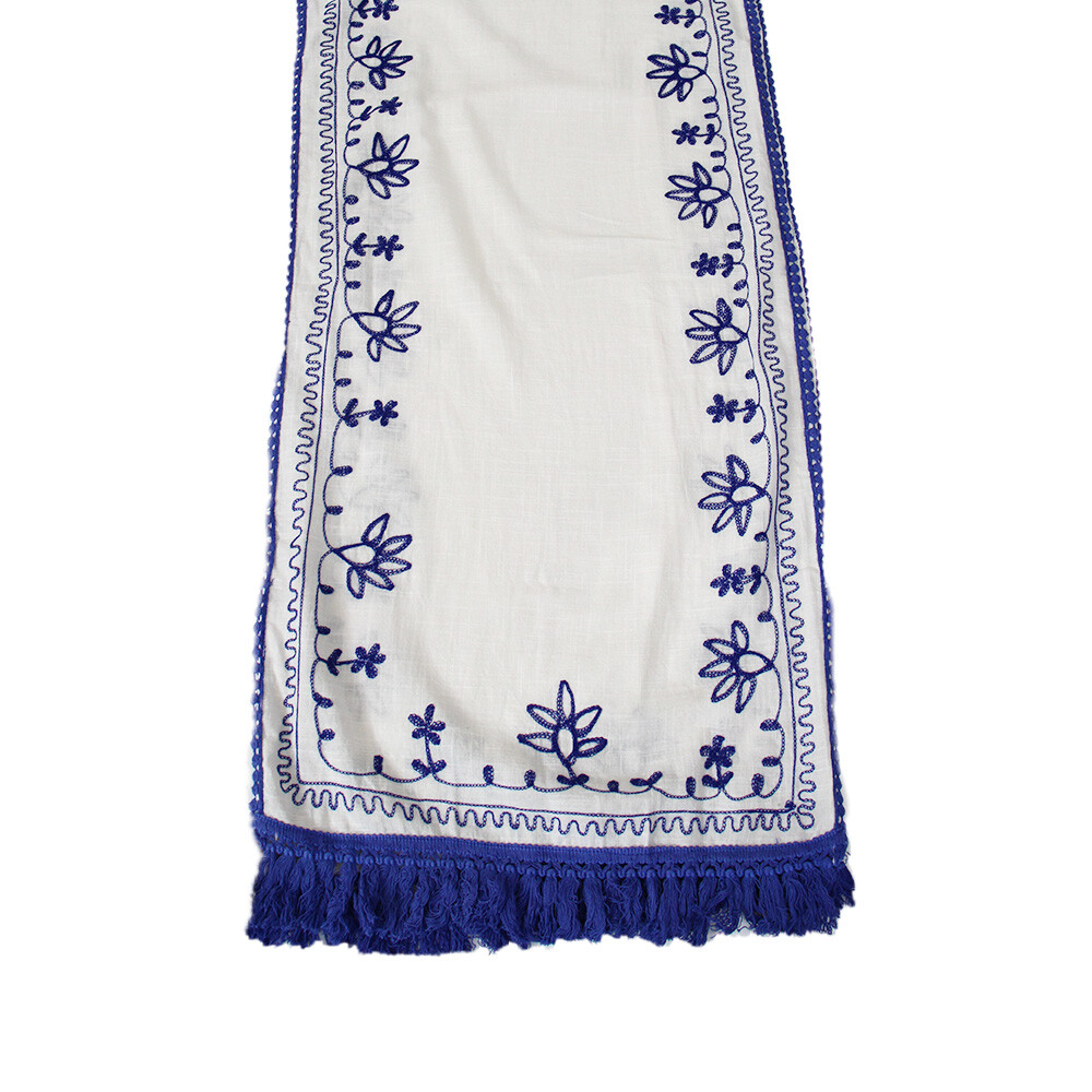 That’s why we brought in our Table Runner Embroidered Aditi. This is a great option for pretty much any retailer that deals with cloth goods - premium or otherwise. It’s 100% hand-embroidered cotton that measures 40x180 cm, fringed to boot! The hand embroidery is this wonderful intricate floral detailing done in a bohemian blue on an off-white base.
