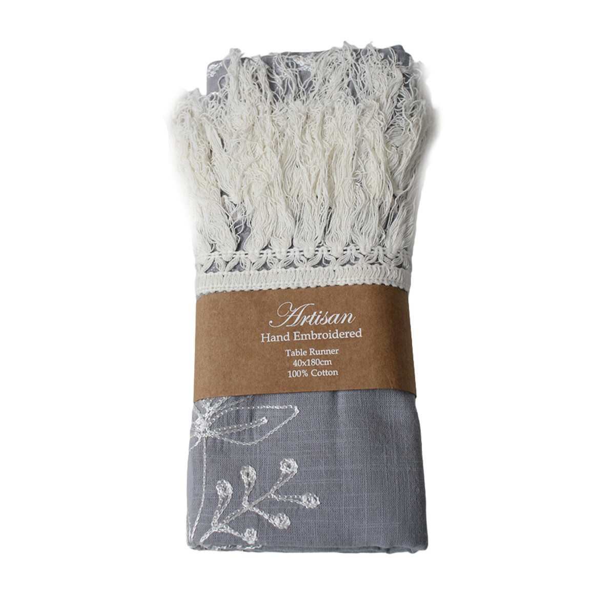 Table Runner Embroidered Denim There’s something about textiles that are both soft and sturdy. We all gravitate towards things that have a certain warmth to them while still promising longevity - and this is it. This table runner ticks the box, with a botanical pattern that’s woven in, not printed on like so many others we see on the market these days. It’s our Table Runner Embroidered Denim - and it’s made from 100% cotton. And this - this is a statement piece. At 40 x 180cm plus the thick, long fringe at the end, it fits large dining tables but we’ve had plenty of clients using these on console tables as well. It can be used in bedrooms and lounges and at coffee tables. Clients have said they’ve used these to style up spa rooms as well - so there’s plenty of versatility here. In short, people are going to want this if they see it in your shop.