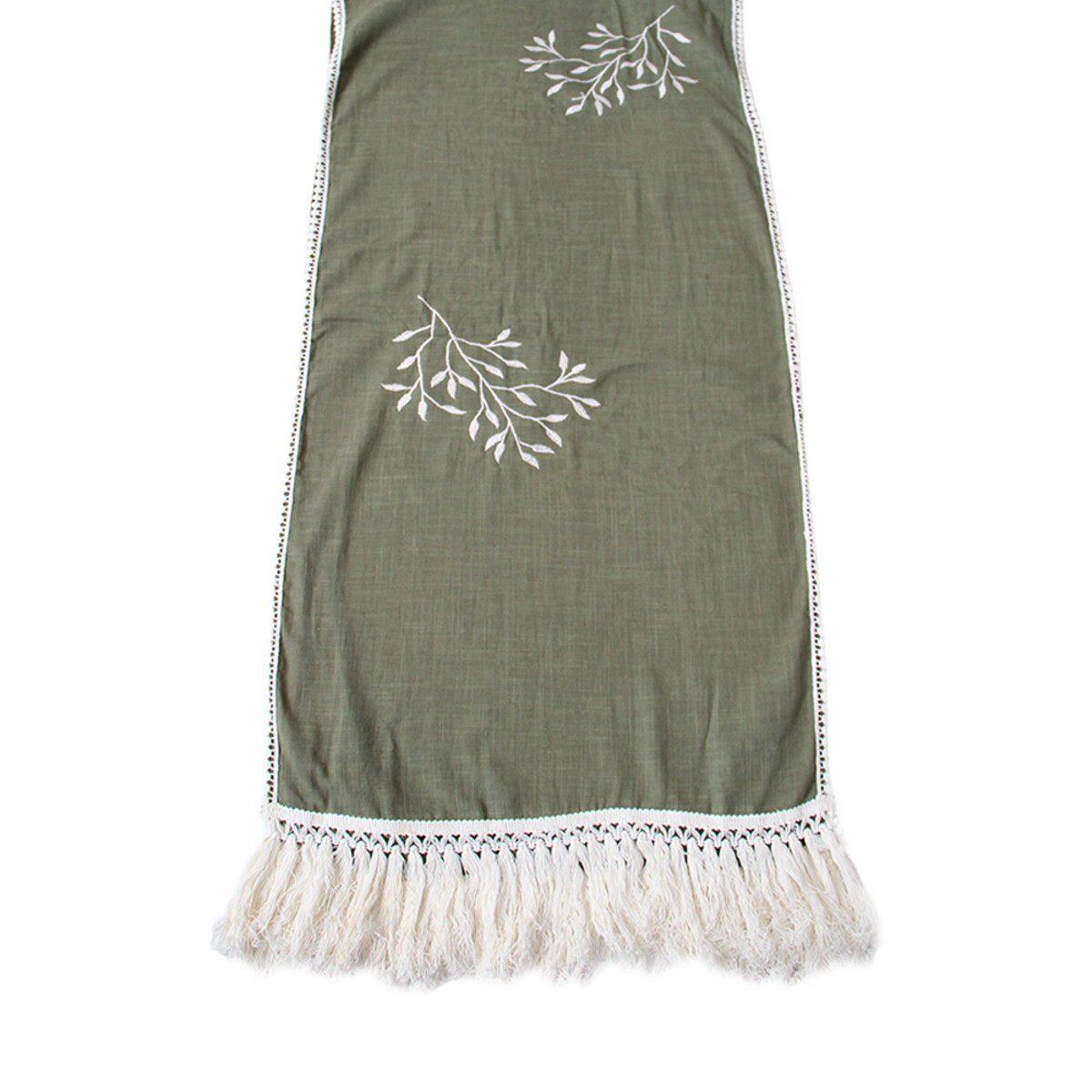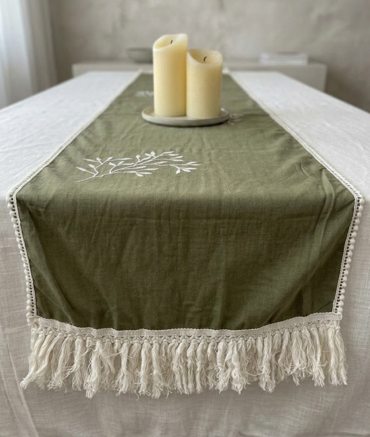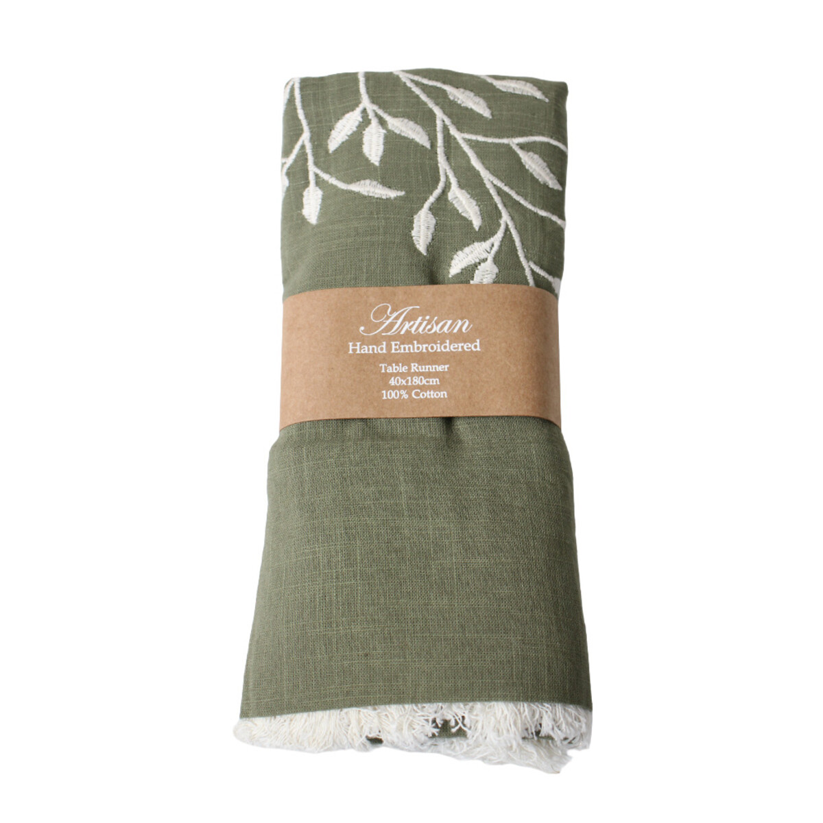 A muted olive green textile runs through the whole length of this runner, with the same hand-embroidered leaf motif repeating itself in neat symmetry. What really brings out the quality though, is the wide crochet lace border - a charming little detail that everyone who has seen this product loves. We can see this work so beautifully on a dark walnut table or even as an accent piece in homes styled with a more farmhouse-meets-modern vibe!