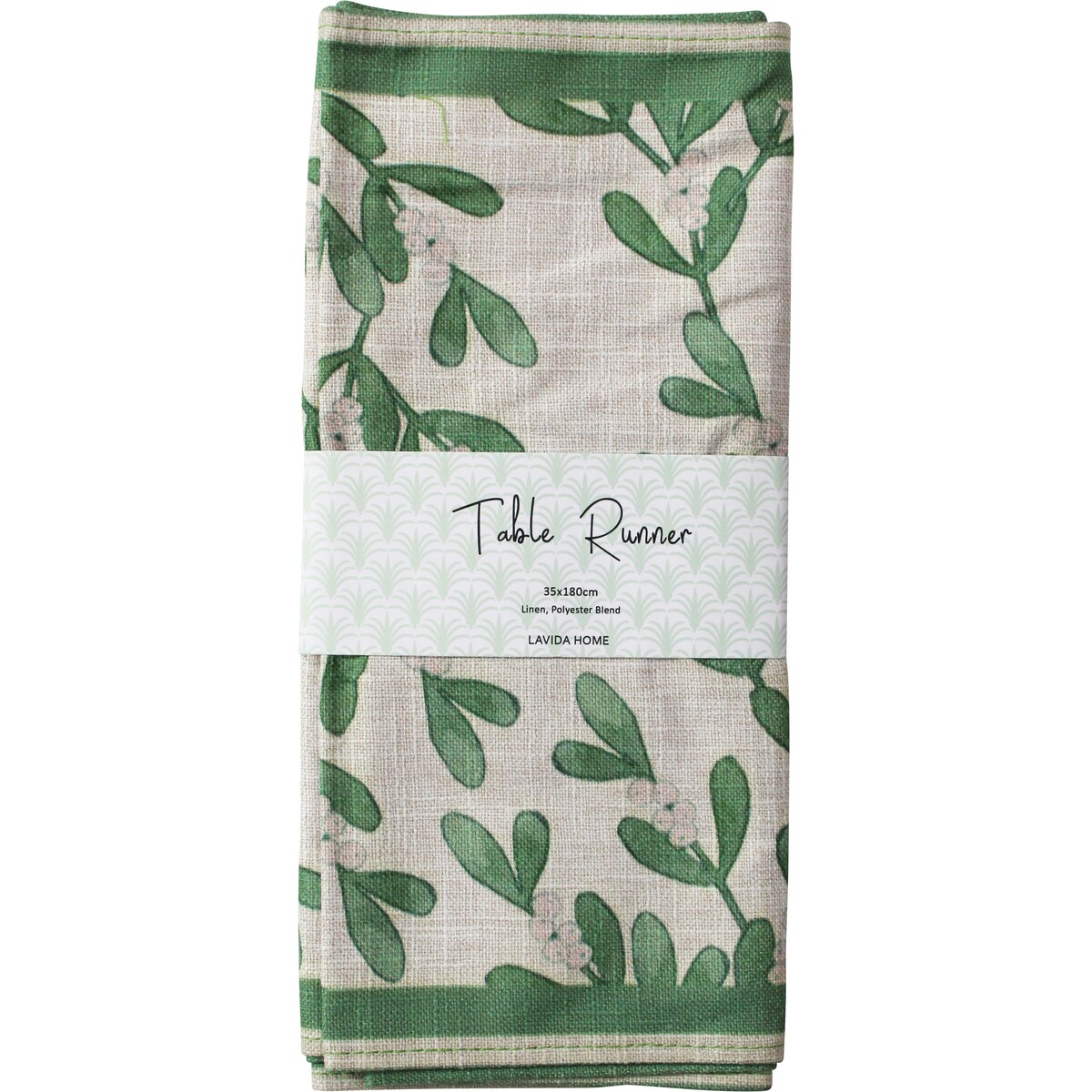 A runner need not be limited in its roe at the dining table alone and can be used on coffee tables, sideboards and the console or infuse the space with colour and patterns. This garden inspired piece is a fine combination of linen and polyester fabric that adds a luxurious touch to the space. The leaf print in white and green and the additional edging in green adds colour that is vibrant yet as in the case with green-serene and Spring time like. Perfect for that garden setting, your BBQ night-or your everyday usage-add this accessory that makes every meal special with its classy and elegant presence. Can be washed clean and will retain its gorgeous colour and superb texture.