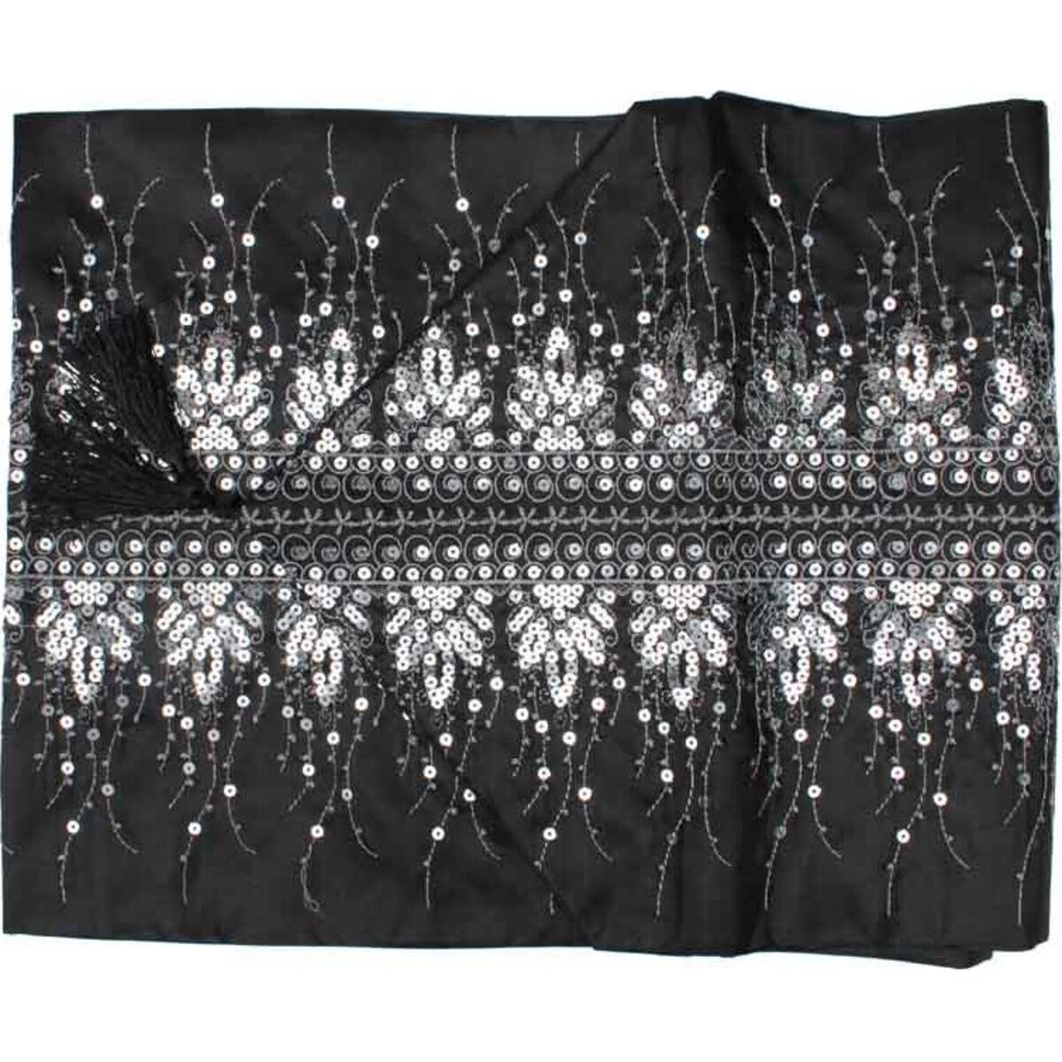 A stunning silver embroidered pattern runs vertically down the center and its beauty is only enhanced by the numerous silver sequins that are strategically placed over it. The runners come to a point at either end with a single black tassel hanging from each. The design and style of the runners make them perfect to use for any special occasion or in almost any room decorated in a contemporary or modern style. In addition to adding lovely detailing to the table setting, they also protect the table from heat and stains. The runners fit average sized tables and are perfect for a casual or semi-formal setting. One of the best characteristics of the runners is that their black colouring allows for easy hiding of stains and spills.