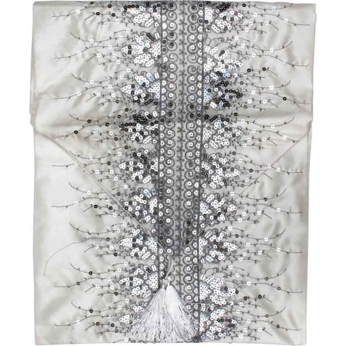 A gorgeous silver swirled embroidered pattern runs down the middle from end to end while a silver flowing pattern extends from the center. Silver sequins accent the pattern beautifully and add sparkle to any table. The runners are pointed at the end and have an ivory tassel hanging off the point. Considering their exquisite design, they're ideal to use for special occasions as well as day to day use and can work in well with a semi-formal table setting. The runners fit average sized tables and do double duty by protecting the furniture from wear and tear. They add class and style wherever you put them and are durable enough to hold up long term. They can roll up easily after use and take up minimal storage space.