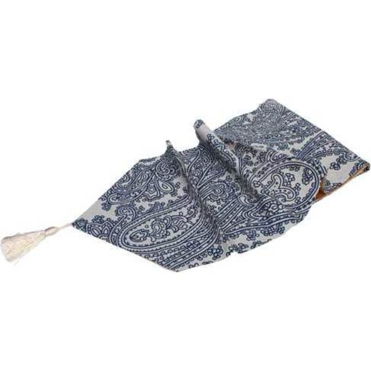 Each pale blue table runner features a bold navy blue paisley print over it from end to end with a white tassel hanging at either end point. This lovely piece will brighten up and add charm to even the most boring and bland tables. You may want to save it for special occasions, but it's too lovely to not try to use on a daily basis. You'll find every excuse possible to keep it on your table and invite guests to a meal just so you can show it off. And really, who can blame you?