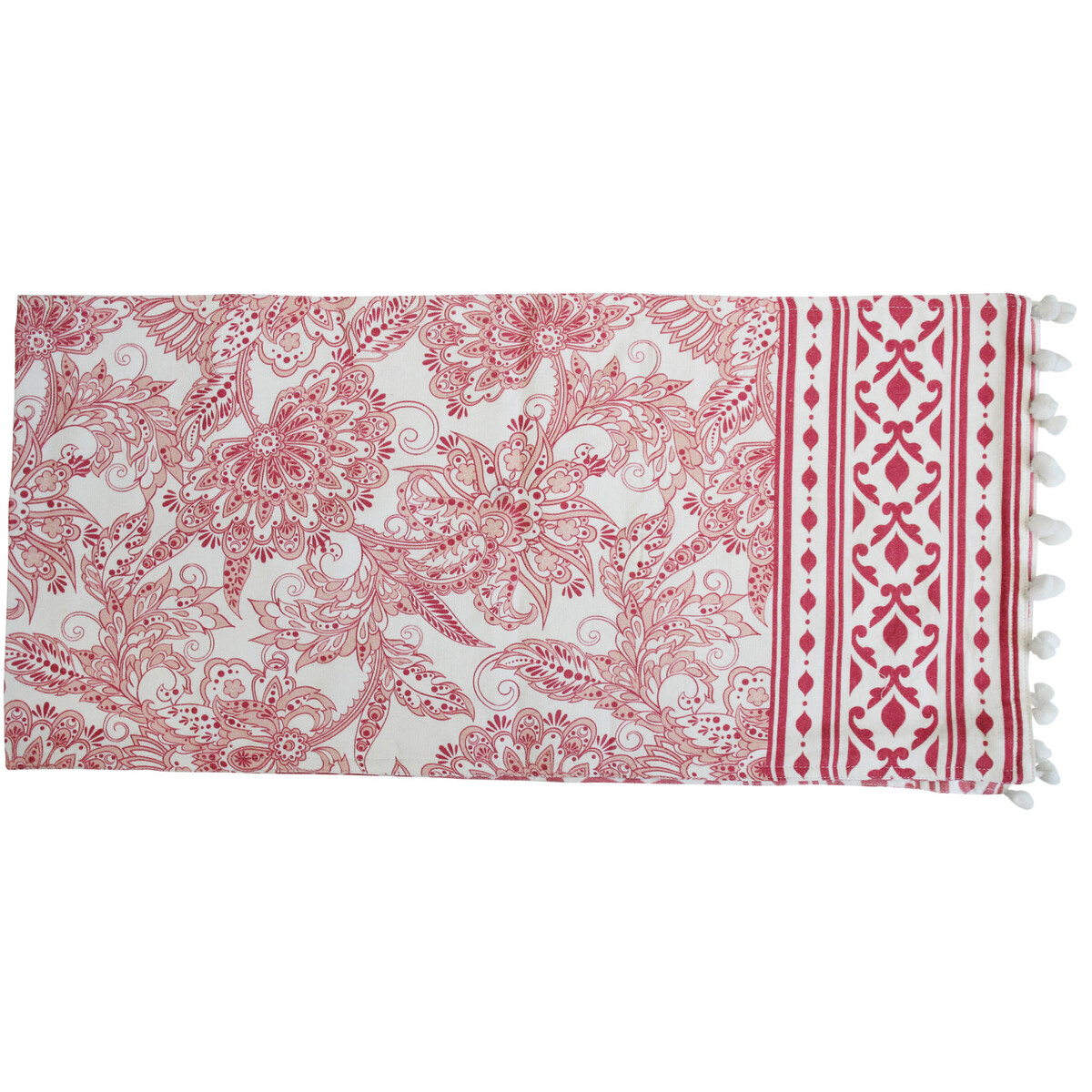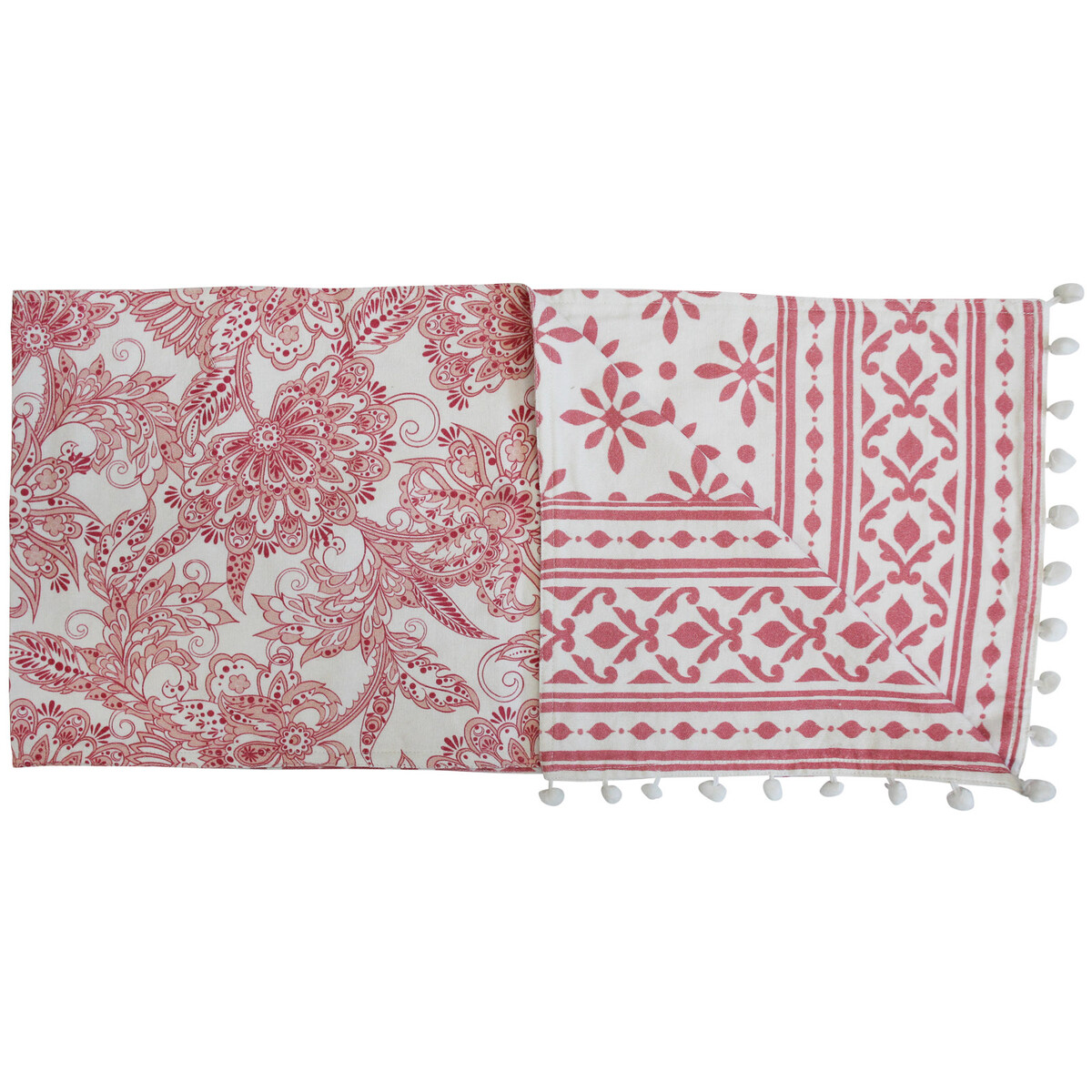 Delight your spaces with the presence of a cotton made runner that fits in with your love for classic table setting. The print is detailed with a deep fruit punch colour with a varying print on its reverse. Will combine well with porcelain and all of your formal table setting to give your special occasions look, that is all the more attractive. The length at 130 cm and width at 30 cm it is great for a six-seater table. The pompoms are the detail which adds to its chic and more modern in appeal. You could use it right down the centre of the table or have a few of them running down the breadth of the table for a more dramatic kind of look. It's used when you replace table mats with runners covering two seats opposite each other. Runners make a table look attractive and help give amore neater and well finished appearance to food and beverages served on it.