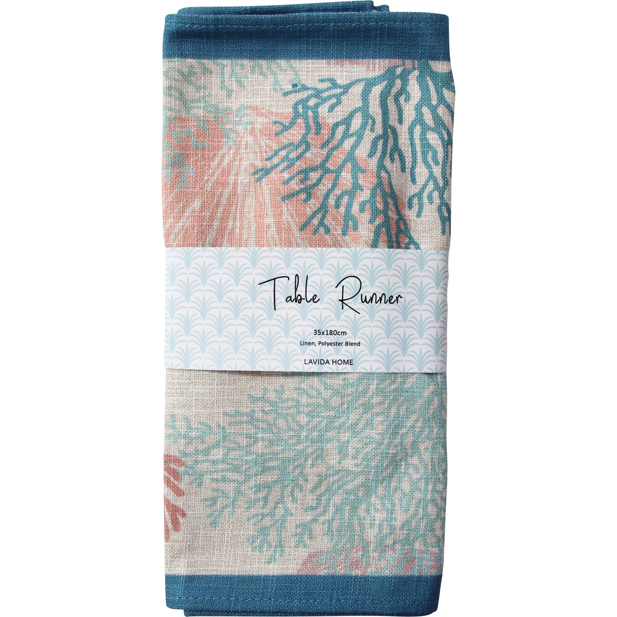 A table runner can be used in the most versatile of ways to help add amore colour and character to table spaces and in this case the inspiration from the ocean world adds to that delightful look. Made from a blend of linen and polyester-the feel of the fabric is organic and it shows off the colour of the print with great perfection. The finish given in the form of the blue lining adds to its chic and contemporary look. Will complete the look of the setting in the most elegant of ways. About 180 cm in length and 30 cm in width makes it a great choice for a four-seater or six-seater table and it would look equally delightful draped across the sideboard or the large coffee table.