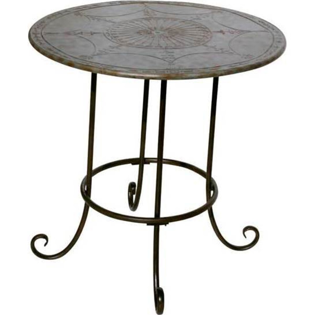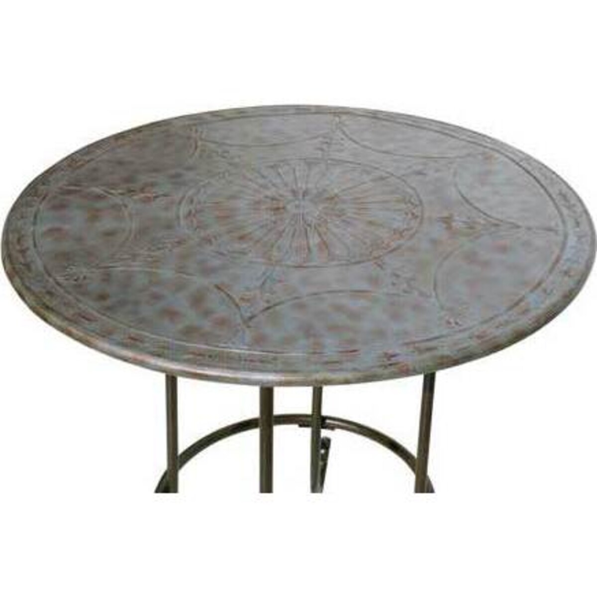 The Table Zinco Round is a marvellous piece of metal craftsmanship having a round top with a stunning enraged design reminiscent of old patterns found in designs of the yore. The delicate legs are curved yet it beautifully balances the table making it a rather sturdy piece of furniture. Almost two and half feet in height, the table serves well as a corner piece where a lamp or some decor items may be placed for effect. It would catch the eye not just with its gorgeous metal detailing but also its dull antique look finish. A marvellous way to add the retro feel to the ambiance would look even more stunning if one adds some more bric - a - brac along with the table - perhaps very old copies of books or an old wall clock, and the retro theme will surely come alive. Would also look wonderful as a coffee table out in the patio - its ruggedness will allow usage outdoors as much as it would indoors. Will work well as a centre table out in the garden under an umbrella or even as a bedroom addition where one may wish to create a little corner with a retro theme.
