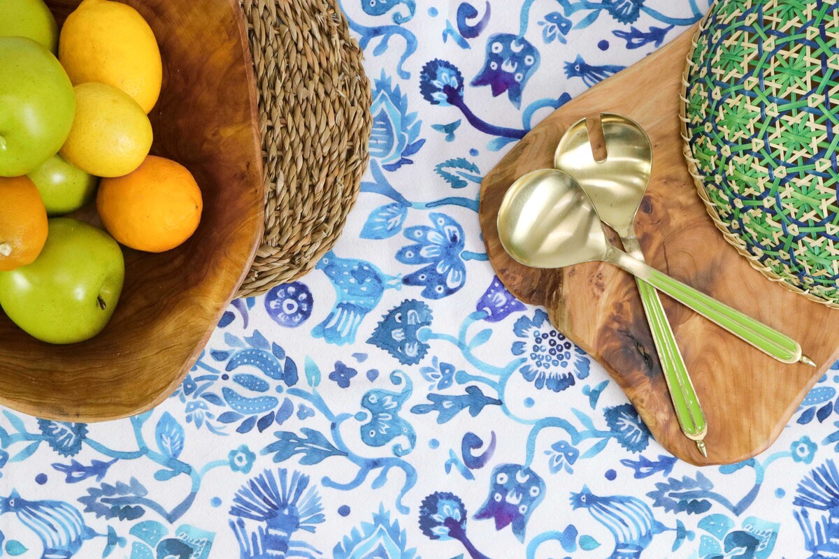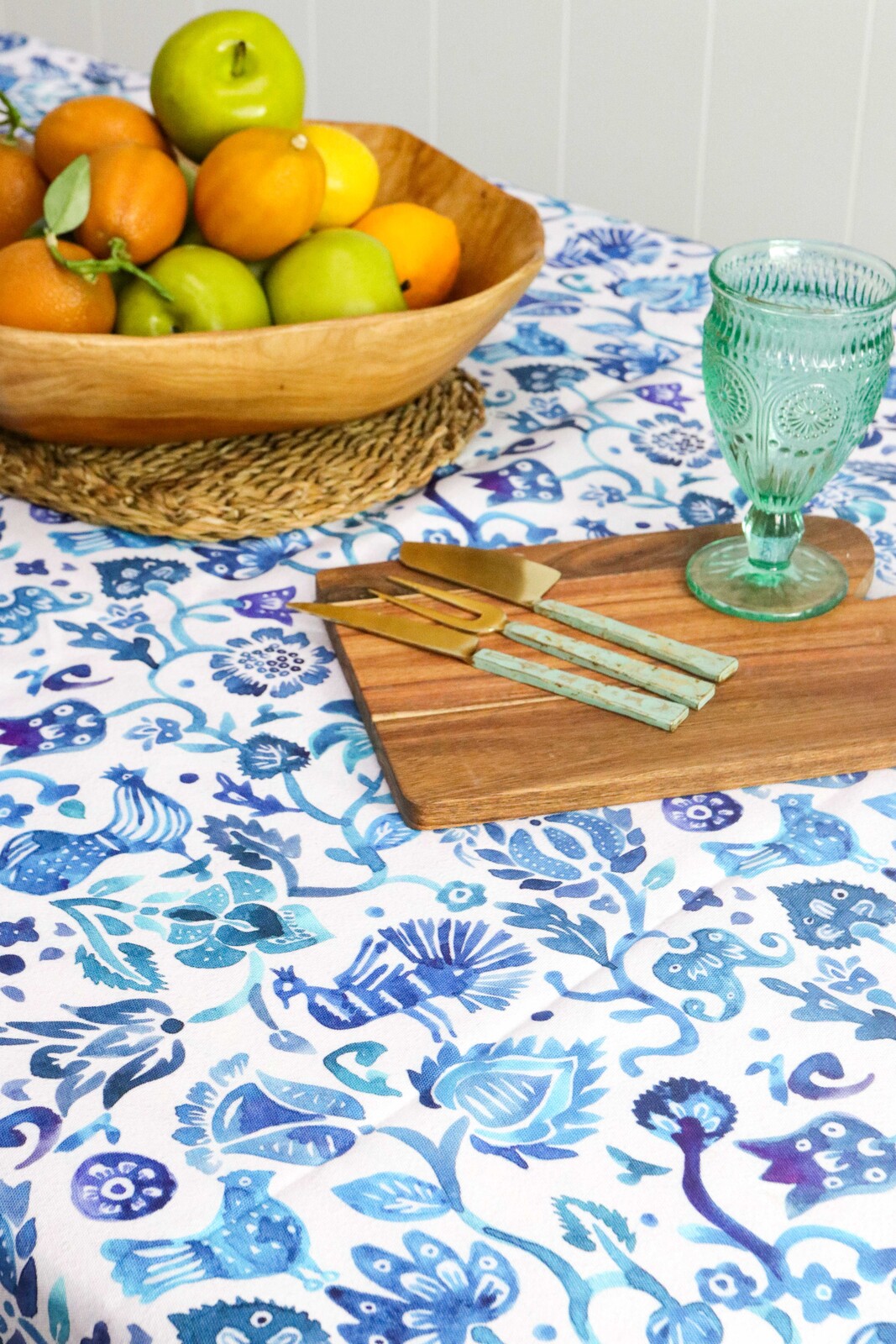 The glorious colours remind you of Santorini mornings-the blue of the sea matching the brilliance of the skies on a clear day. The advantage of table cloth with such colour schemes of course is in the multiple ways in which it could be combines with all kinds of colours-from bold yellows for more drama to seagrass weave for more of an organic appeal and if you wish to f=go with the traditional choices there are of course numerous options lie white and blues and greys. A great means to enhance the beauty of your table top space and make your everyday dining feel special. The size is suitable for a large six seater setting which could also be extended to seat eight.