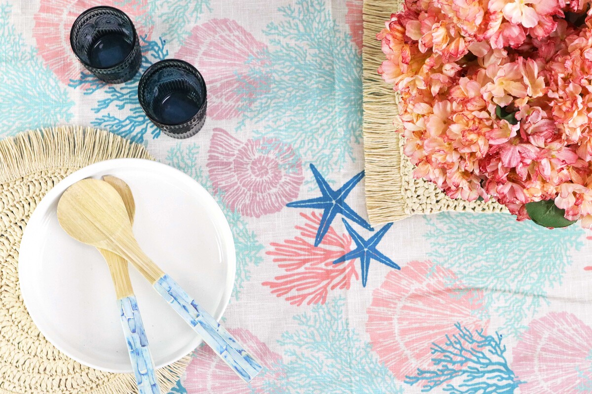 Runners claim centre stage right away-helping bring the various elements on the table to a cohesive space- be it the placemats or the crockery and cutlery-they are bound to combine beautifully with this gorgeous colourful and softly hued runner. The length is 180 cm which makes it suited for a six seater or a four seater table. the coral reef in a deep turquoise, the shells I and the whorl pattern as well as the star fish in the print adds to the kind of interest it will build into your spaces. runner will wash easily and will retain its subtle colours and well-defined print. Add placemats which will either contrast or simply use white to set off the details of the print and the usage of myriad colours.