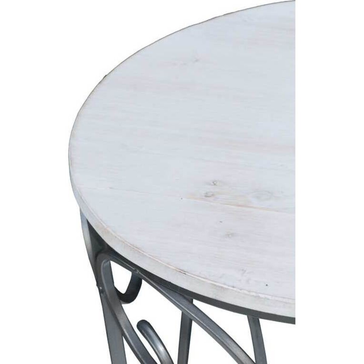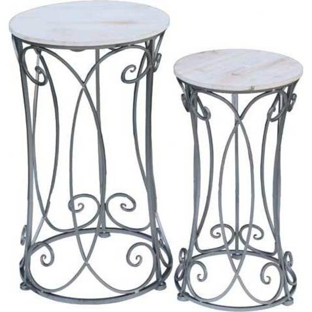Tables as chic and as imaginatively designed to give an ornate look to the home is a specialty from Lavida whose metal craftsmen are especially adept at making the finest of designs with such a tough medium to handle. Here the base of the table has been worked on with elaborate scroll design forged patterns that make the look of these round tables all the more elegant. Whether used in the indoors or in the outdoors they will set the look of the space apart with their presence. Having such tables at home allows one to take the party to the outdoors when the need arises. Indoors it could be used as table ends, corners table or even in the living room for creating pretty display focuses . The larger table has a height of 65 cm and the shorter one of 54 cm, their look is magnificent in its beauty - shabby chic with white distressed paint effect that looks classy and distinctive.