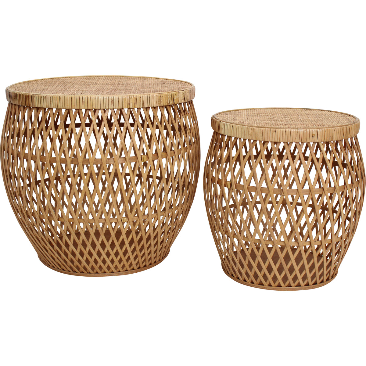 Usher in a lovely organic feel to your setting with a small addition in the form of two tables that come in round shape - created from rattan and sized in manner that they would fit into even the smallest of rooms, giving you the advantage of table top space. the round top is well balanced by the base which is also crafted from rattan in lattice like criss crossing design, dense and yet lightweight enough to be shifted around and used where you need these tables. The shape curves outwards and then narrows to a small round base thus giving the table adequate balance even if what you place atop is heavy. A great means to help create some extra seating where the need arises.