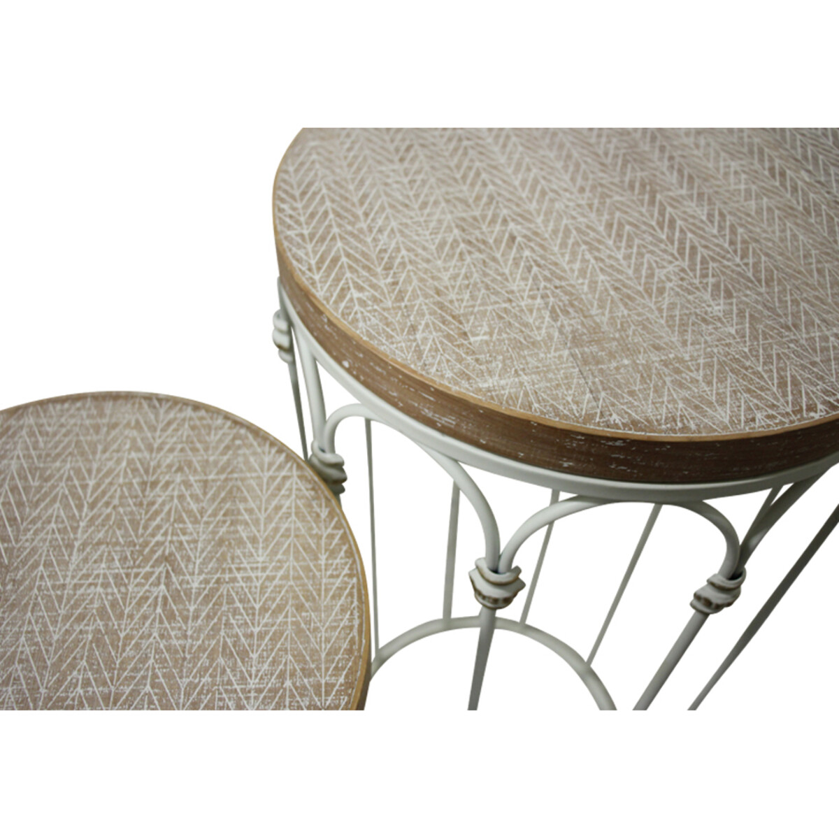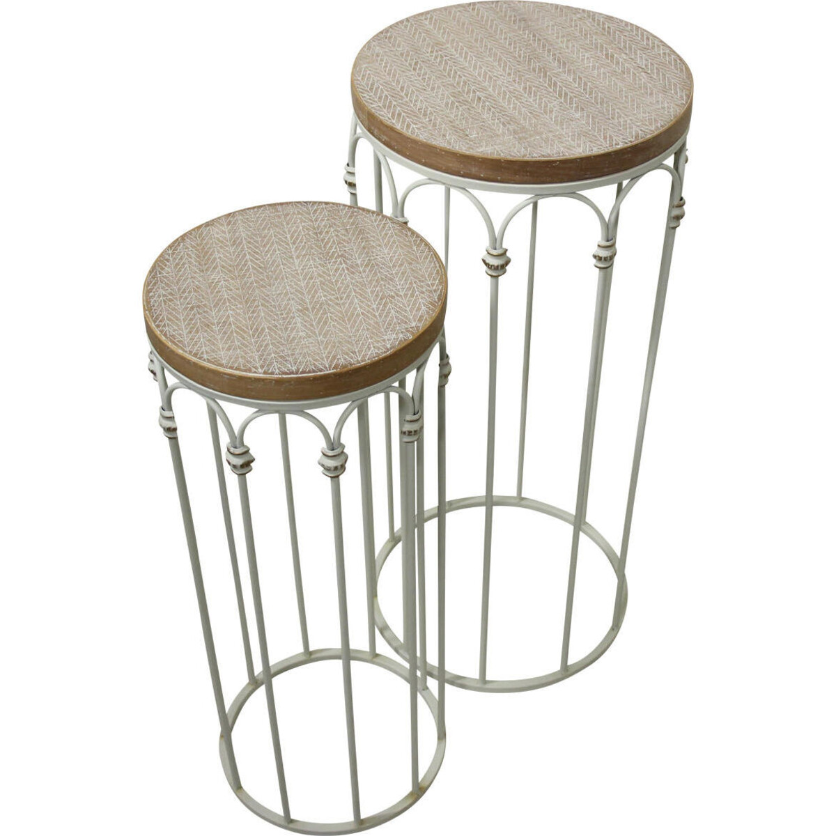 The birdcage - like design of the base metal stripes have distressed rivets at the top curves giving an antique look and each one comes in a different size with one bigger and the other smaller. The difference in size and the diameter of the tabletops gives them multifarious usage where you can slide one near the arm of the sofa to put your coffee mug or laptop and use the other as a side table or even use both with one as a seat and other as a table to dine on. They can also be used as table extensions and double as extra surfaces when you're entertaining guests.