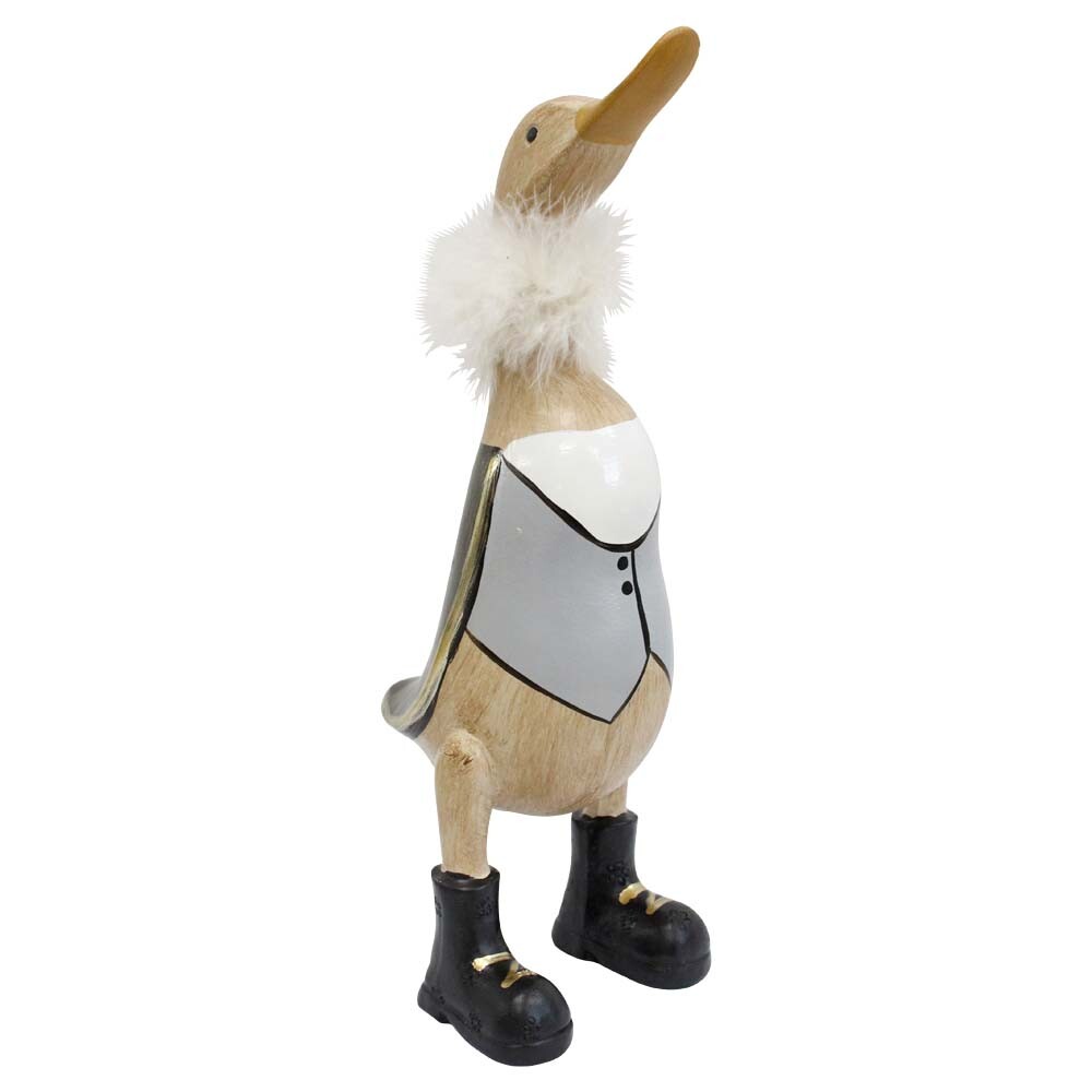 This one’s a real charmer - Tall Duck Howard stands 29.5cm high and brings so much character with his cheeky pose, statement monochrome look, and the cutest fluffy collar we’ve seen in ages. The first thing anyone notices is that high-gloss tuxedo vest with those gold trim details, but it’s the boots that really make us grin every time we look at him. There’s just something fun about the way this duck holds himself - it could be that he’s proud of his feathered ruffle, or maybe it’s just his endearing silhouette.