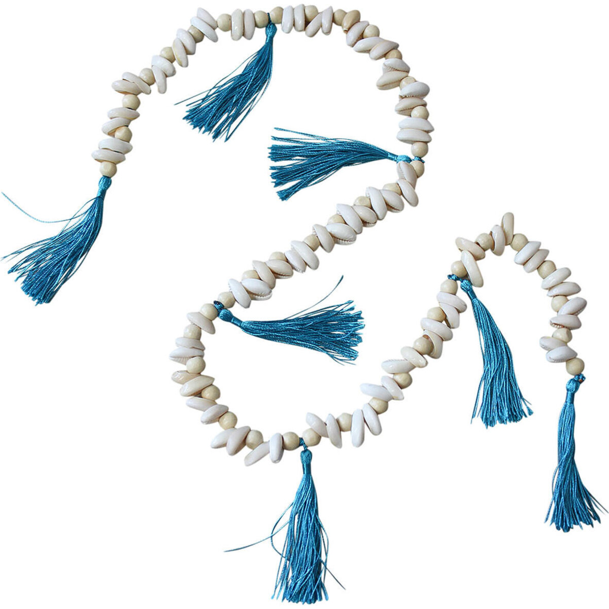 Hang it from the side of the curtain or wrap it around anything that you wish to give a marine and seaside twist, this beaded string made of tiny white shell is long enough to be used in several kinds of ways. A cotton thread has bene used to string the tiny shells which are in all kinds of tiny sizes which gives a wonderful uneven look that adds to its beauty. Bring a harmonious blend of a natural feel real shell accessory to your spaces when you use such a string to embellish anything that needs that extra little love. Use it to decorate bottles or nags, belts or even your clothes of your so desire. The blue coloured tassel made of thread that are added to its contrasts vividly with the white of the shells adding another dimension of colour contrast.
