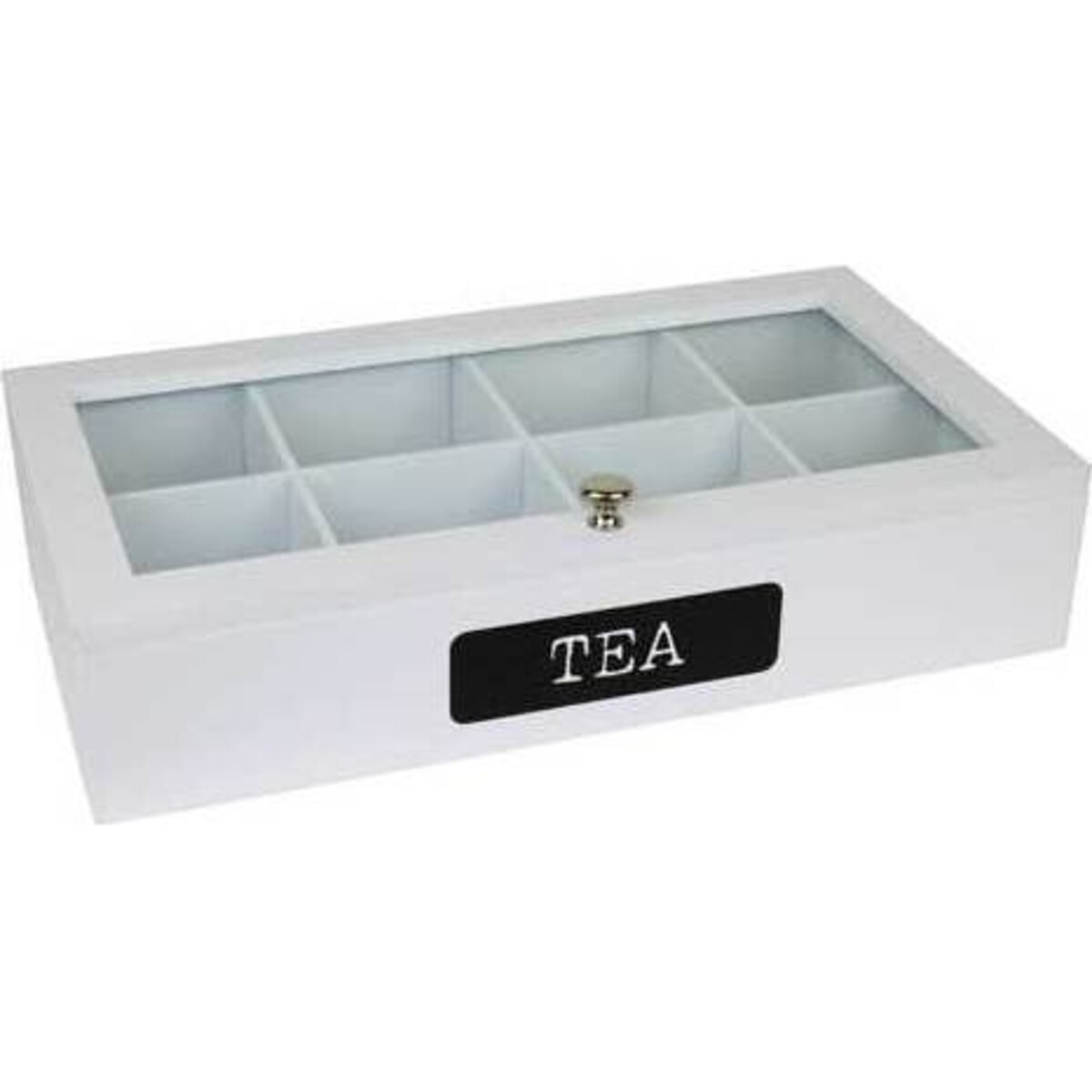 Tea Box for Eight is a kitchenware aid that measures 30x17x7 cm. It is built out of wood for the framework and glass top, with the phrasing éTeaé indicated boldly at the front section. This product is customized for serving eight guests in total at a time, which offers great efficiency when dealing with dozens of guests to an event. Homeowners can purchase two or more sets of Tea Box for Eight. They may set them up at prominent serving points when hosting tea parties at a garden. When not in use, this product would look presentable in its white colour resting in idle manner inside a shelf or cupboard.