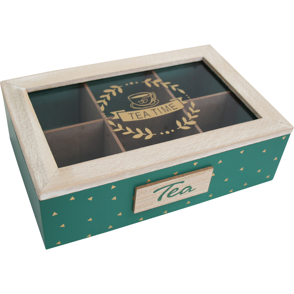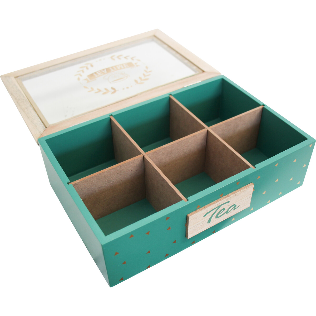 Consisting of as many as six compartmentalised spaces all of which has the same square shape and size, this Tea Box Indie gives your tea loving customers the opportunity of stocking as many as six different types of tea flavours. They can therefore choose to stock different tea flavours such as black tea, green tea, white tea, Oolong tea, yellow tea, chamomile tea, herbal tea, earl grey and whatever other tea flavour pleases them. While the overall box is painted in a visually charming jade green hue, the wooden compartments are left in their original wooden brown colour.