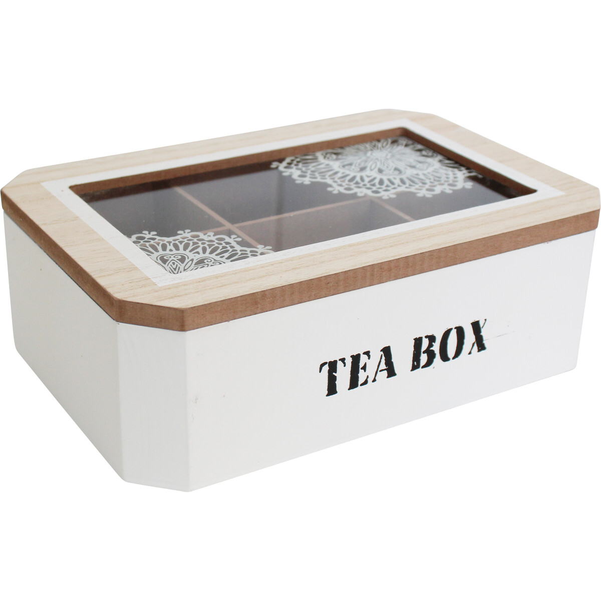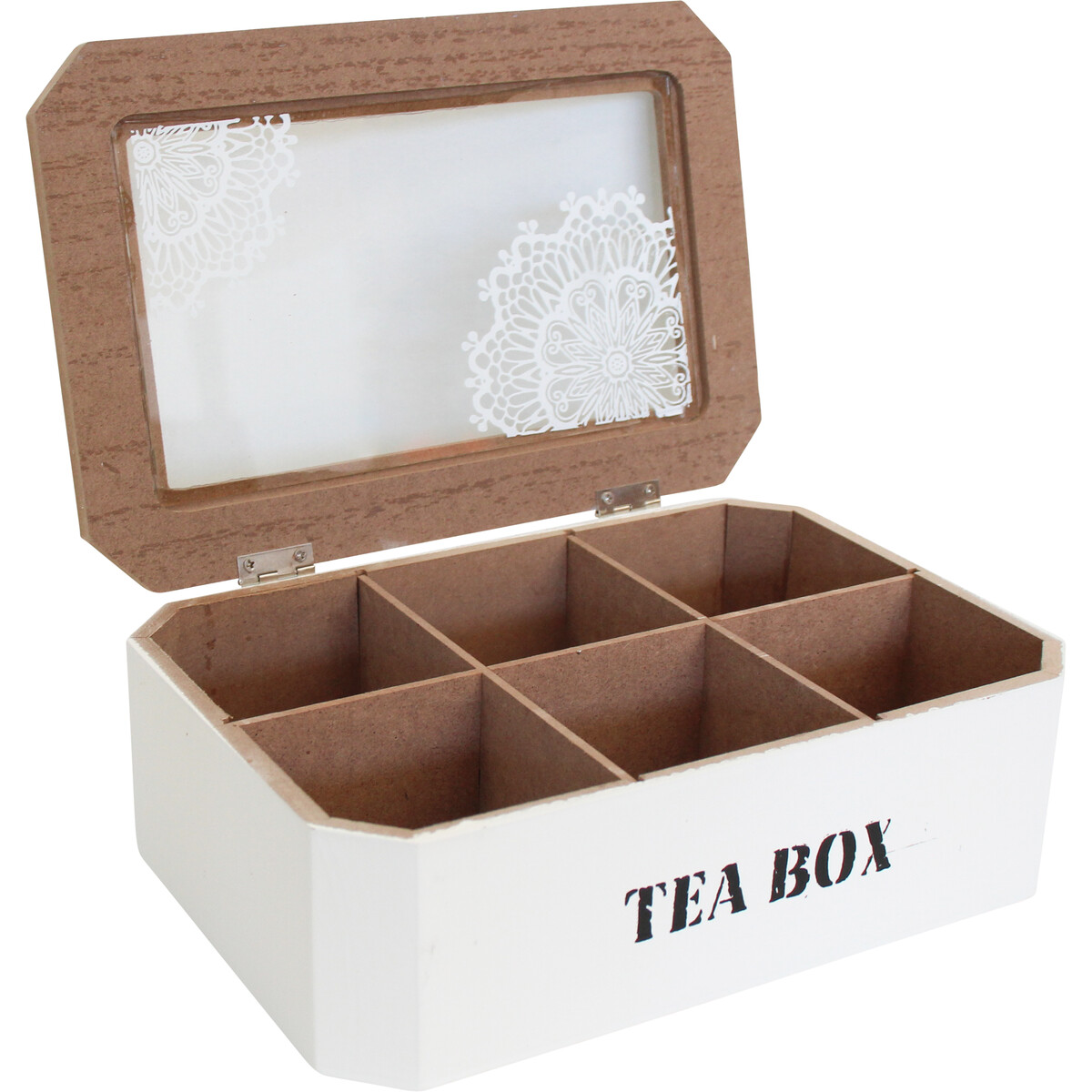 The Tea Box Mandala is made in a fairly long palette which measures 23 centimetres in length, 15.5 centimetres in width and 7.5 centimetres in height. It is made using medium density fibreboard material with the top finished in a brown wooden palette with an ornately decorated transparent nylon. The interior of the tea box inclusive of all six compartments is equally finished in a similar wooden brown hue while the rest of the exterior of the box is painted in pristine white colour. On its front exterior is boldly written the words "TEA BOX" in jet black letters.
