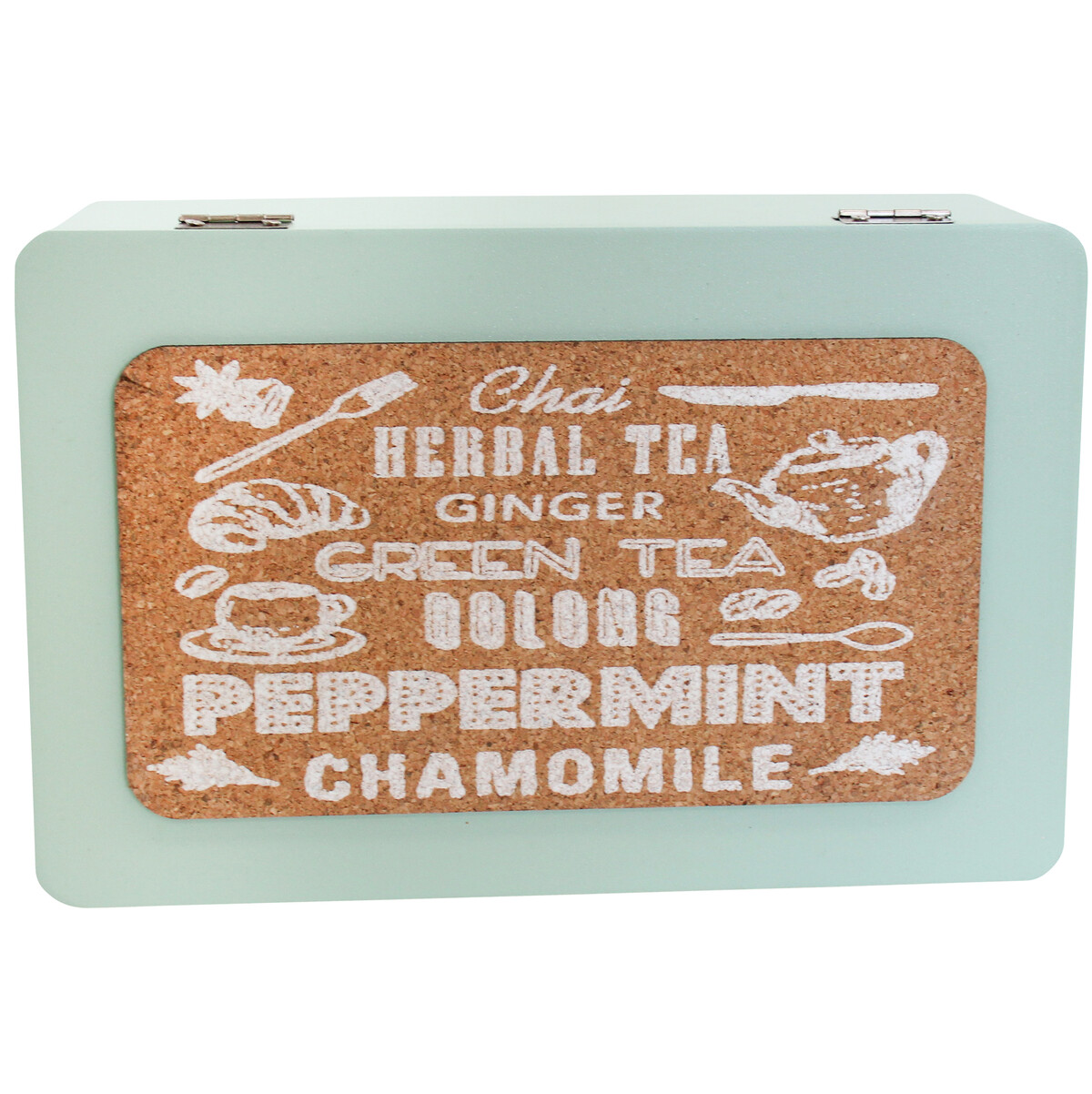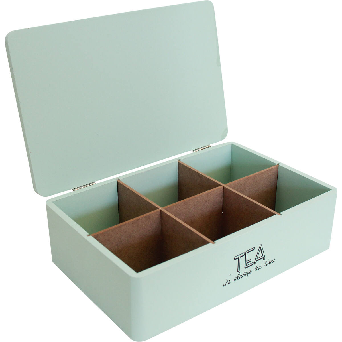 With enough room to stock not just one single aromatic tea, but as many as six inclusive of green tea, ginger tea, oolong tea, peppermint tea, white tea, herbal tea, earl grey, yellow tea, black tea, chamomile tea, and whatever tea flavour which your customers wish to stock up. On the top of the lid is the brand's name which list several varieties of teas which this box can be used to store. The rest of the wooden box is painted in an appealing emerald green colour while the interior compartments retain their wooden brown hue.
