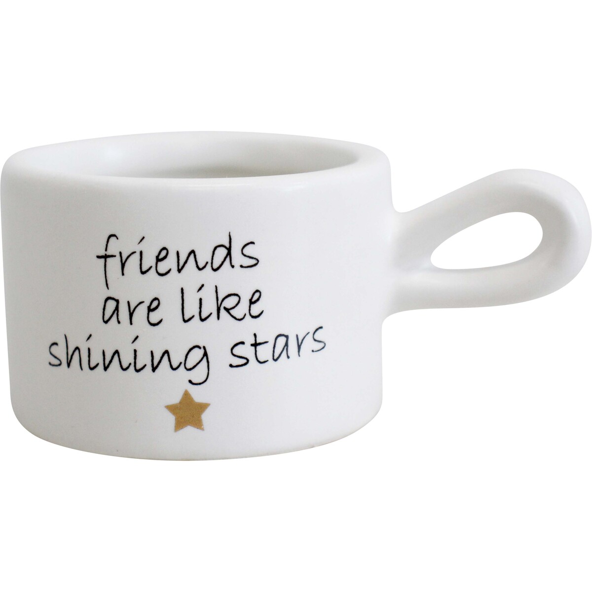 "Friends are like shining stars" are boldly written on this exquisite tealight holder. Create a striking atmosphere in any space with our stylish tealight holder. An eye-catching addition to any decor, this contemporary piece is crafted from white ceramic and features a cup shape that makes it both modern and sophisticated.