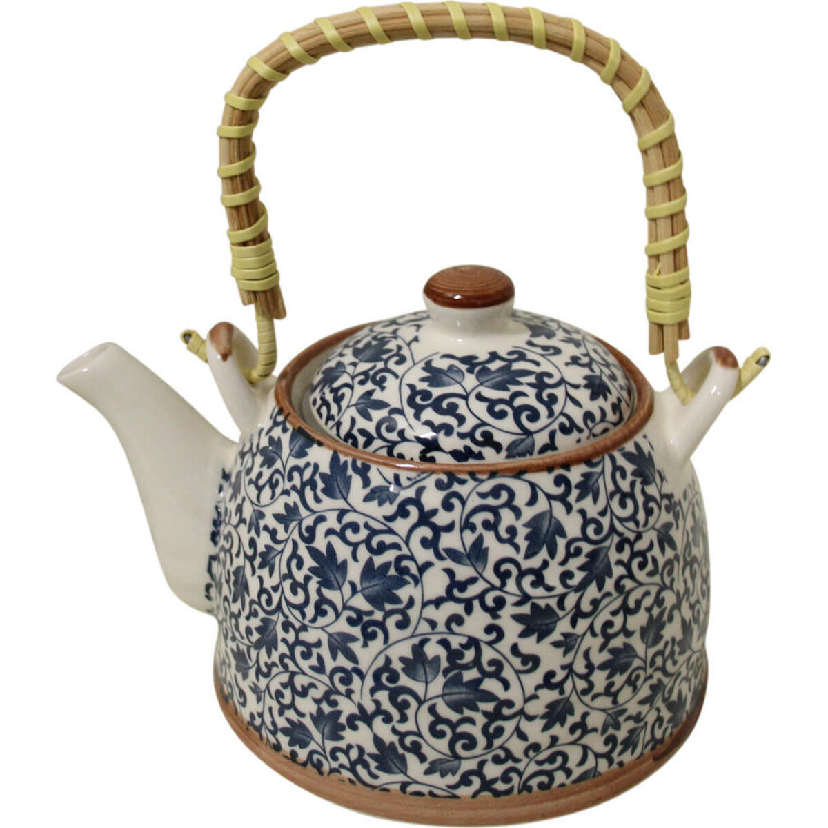 Here is a superb blend of your tea time favourite moment and a classic design in teapots to give this time of the day or evening a special uplifting feel. After all tea or coffee drinking is as much about the beverage as it is about the manner in which it is served. Here is a tea pot that is made from superior quality ceramic that is covered in a delicate blue print on white that has an outstanding sheen on the body. The rattan wrapped handle allows it a more attractive feature. The delicately curving snout and the wonderful classic feel of the teapot renders it the perfect choice for your kitchen counter and your bone china tea set. The tea pot would blend in well in traditional setting as it would in a modern one with as much ease. Such splendid way of making your relaxing moments of the day feel really special. The tea pot is al of 17 cm in height and 12 cm in diameter. The lid sits perfectly well on the round opening while the handle helps balance the kettle when it is filled to the brim.