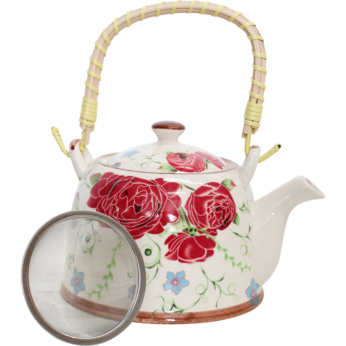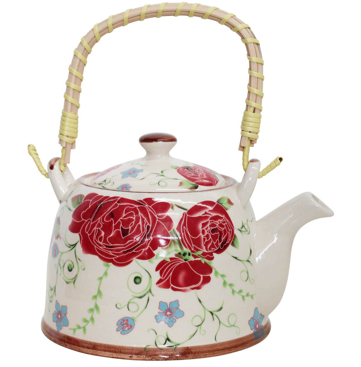 Possessive of a balance of decorative floral accent and natural appeal, this teapot is ornately moulded in an outstanding design which will capture the attention and heart of your customers wherever you choose to display it. This is because the exterior of this compact sized teapot is decorated with the image of a brightly coloured flower using shades of red, green and blue over a pristine white backdrop. The stylish ergonomic handle is made through the use of organic cane material. Apart from the tight sealing domed cover; this teapot also comes with a detachable sieve.