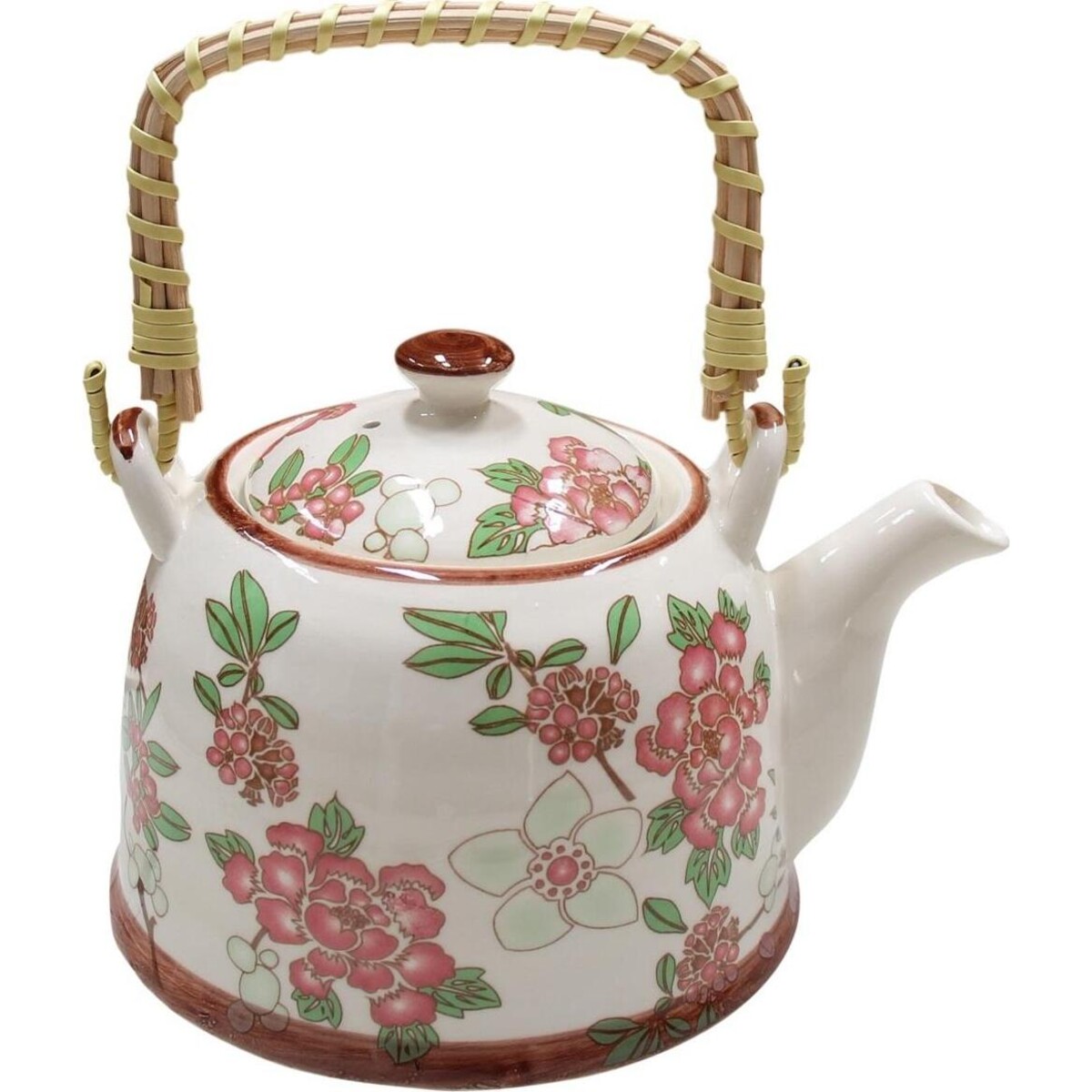 Add a touch of old-world elegance and grace to the manner in which you serve tea. Take it slow and easy by adding hot water to the leaves placed in it and let the wonderful brew get ready, taking its own time. After all good things need a touch of patience and helping you get the act right is this handcrafted teapot that puts the old-world charm of tea brewing back in its rightful place. The teapot handle is wrapped in bamboo strip which helps give s fine grip and keeps the handle insulated. While holding, there is a sturdy grip and the pouring action is smooth and effortless. The snout being angled the right way allows the tea to be served without any spillage. The tiny little lid sits well in its groove and the very size of this teapot makes it convenient to handle its height is all of 18 cm and its dimeter at 14 cm, makes it sufficient large the pink blossoms on its body on fresh white backdrop gives it a beautiful and refined look.