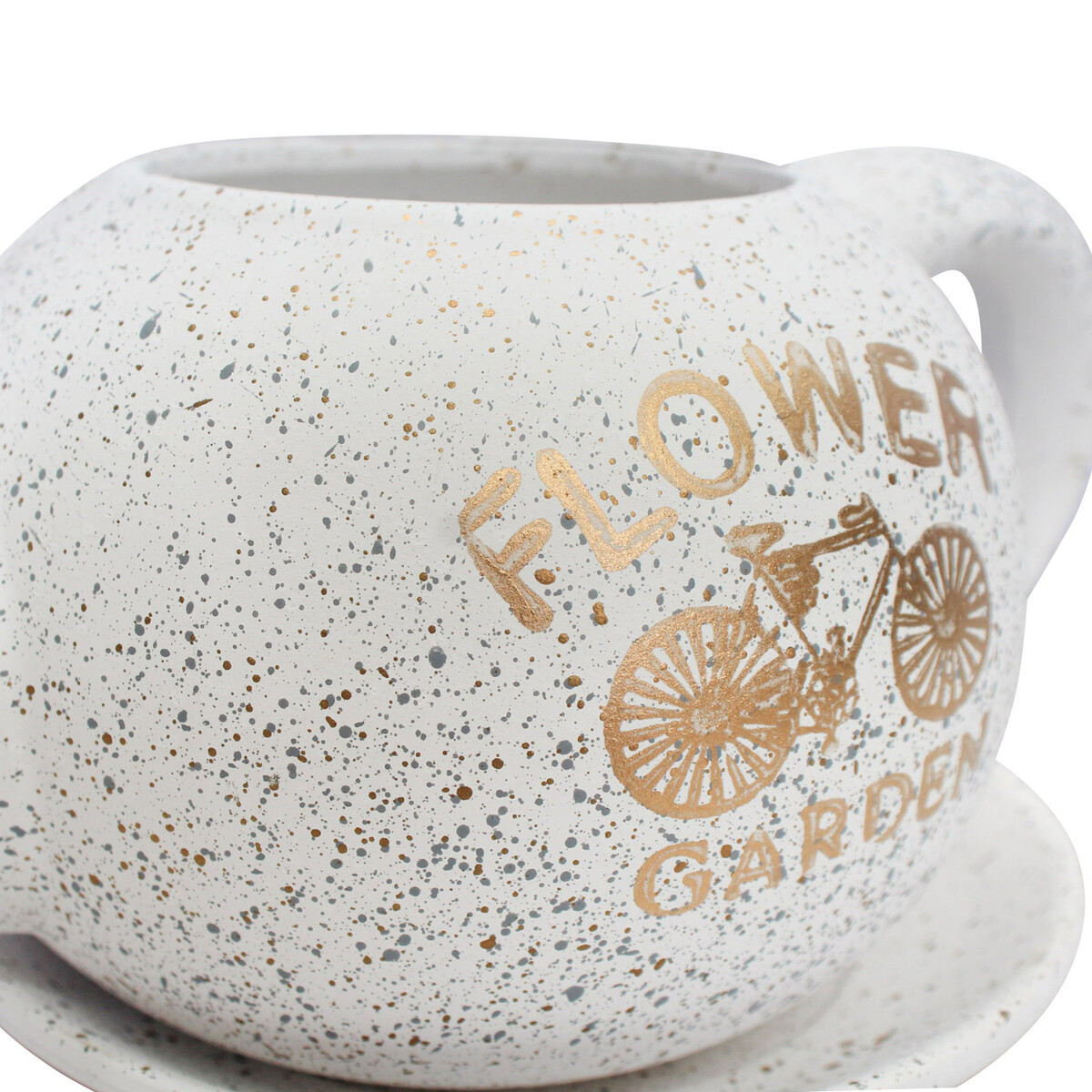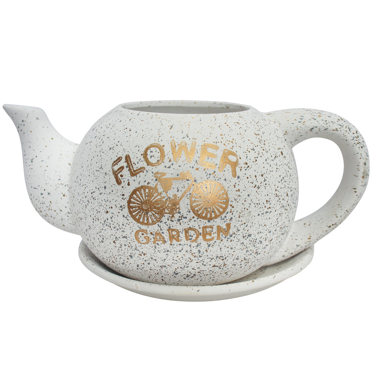 The teapot is shaped in such a manner that it can quite easily play the receptacle of a potted plant and will work equally well for directly planting in it as well. This ceramic made piece has been given the right deign detailing that makes it a great fit with the purpose for which it has been designed. the teapot has a height of about 14 cm and around curved body that has a maximum diameter of 23 cm . It sits on plate that will catch the excessive water run offs in its 15 cm diameter plate that snugly fits under neath the base of the teapot. The gorgeously shaped snout adds to its delightful looking feature making it quite the show stopper in your green display. Most suited for smaller plants and succulents that have upright stem, which will allow the teapot a clear visual display. Fired perfectly for a glaze and solid structure-the planter will clean to its original sheen with a damp cloth.
