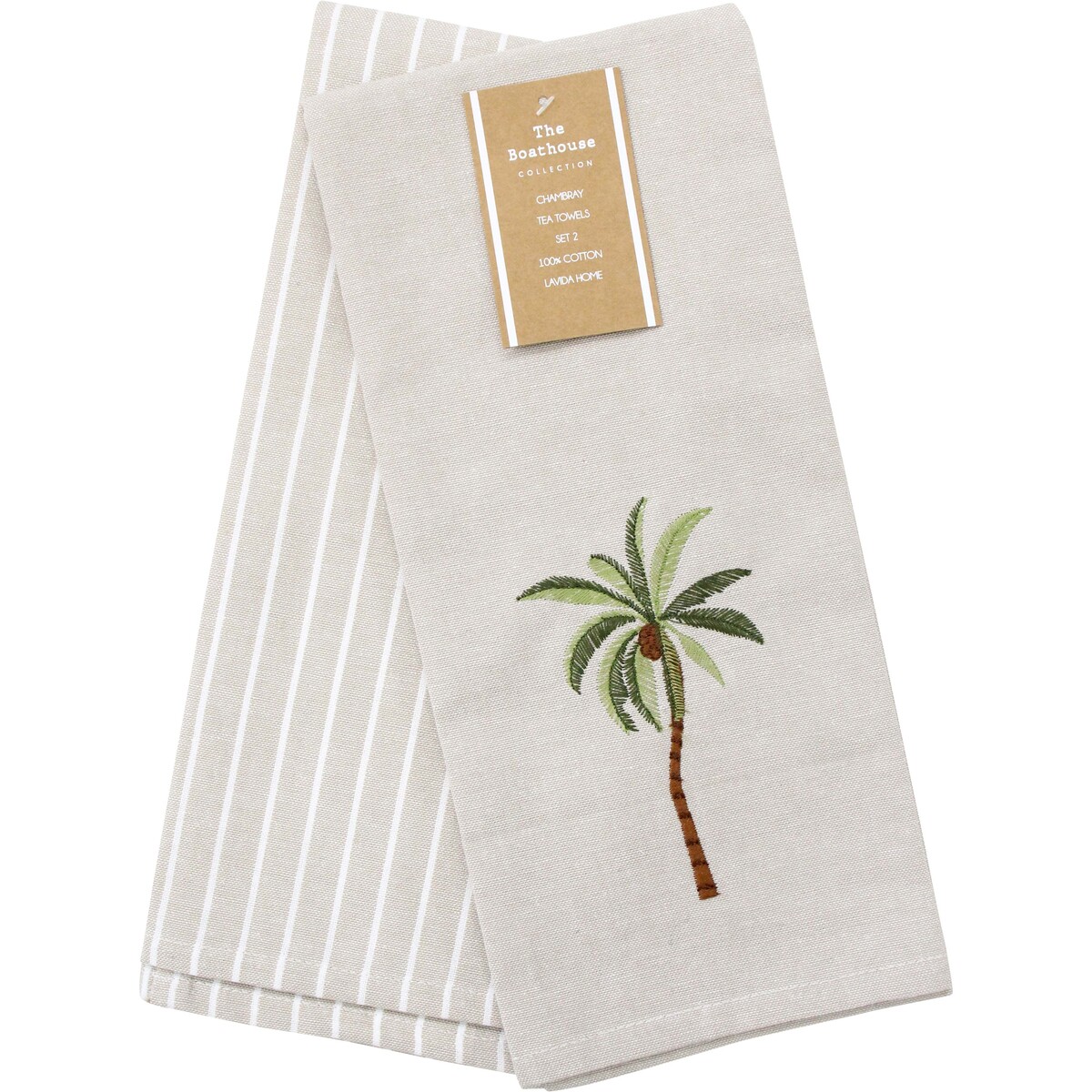 Now this one - the Palm Tree set of two tea towels - feels like a winner for us. The palm motif embroidery? It’s pretty classic, and we’ve seen it cut across quite a few different home styles. If we had to sum it up, there’s just something relaxed and sort of "Aussie summer" in the vibe. The other towel is striped and complements its mate beautifully, so it’ll suit kitchens that lean coastal or even country. We find that customers looking for understated style with a touch of playfulness tend to go for these more often.