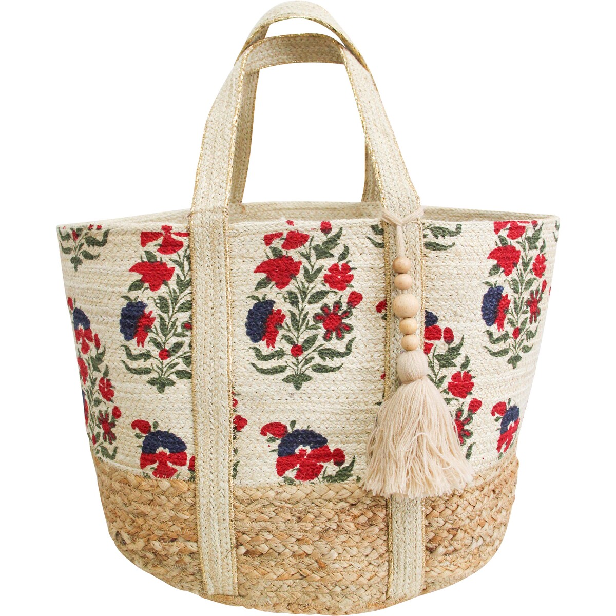 Spanning 50x30x30cm in dimension with an additional handle for ease of transport, the Thea Jute Shopper Bag offers ample space for groceries, beach essentials, or even decorative home storage, easily transitioning from a functional tote to a stylish home accent. The natural beige hue, accentuated with rich, red blossoms and deep blue botanicals, complements a variety of decor styles from farmhouse to bohemian, infusing any setting with a quaint and inviting atmosphere.