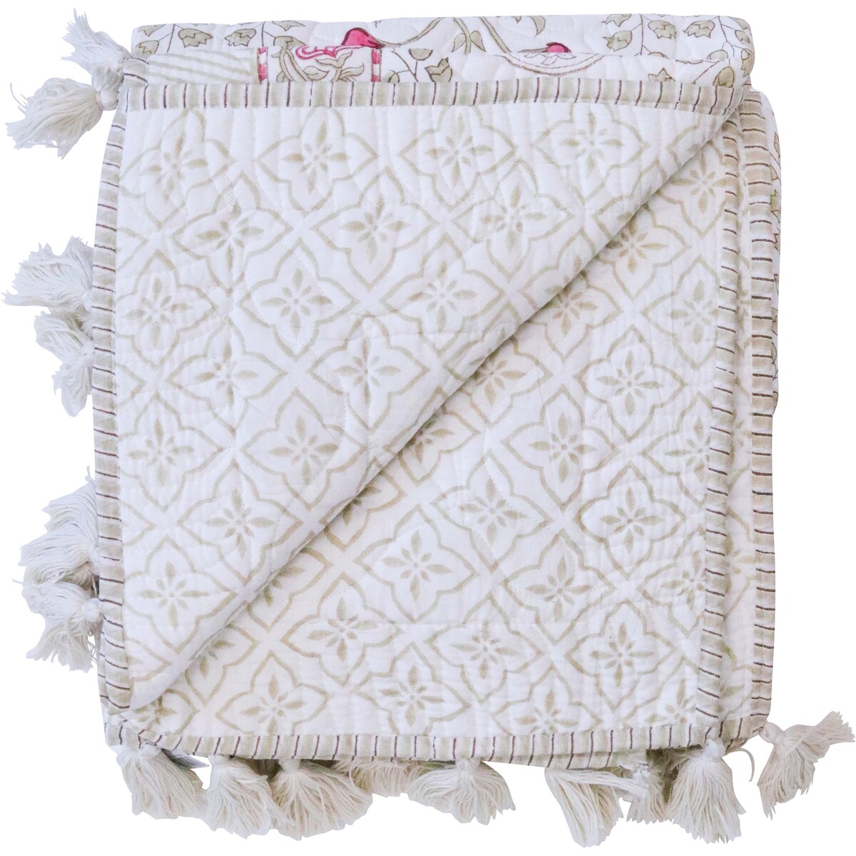 This hand block printed throw really does bring a sense of romance and nostalgia to a space, almost like something you would see in a real old-world home. And that’s what we love about it - it has that familiar, lived-in look that’s missing from so many mass-produced blankets. There is a lovely balance here between the casual beauty of hand block printing and the robust, practical nature of 100% cotton voile fabric. Every one is unique too, there’s just no way to have two identical ones since they’re handmade and part of their charm is the variety in printing and sizing. It brings a softness to lounges or bedrooms and sits perfectly well with modern bohemian decor or even more minimalistic stylings. Because it’s simple but still interesting to look at. But its pretty off-white colour works well anywhere really - even offices when displayed right. Just keep it out of direct sunlight. Its 130 x 150cm dimensions give lots of flexibility for styling too.