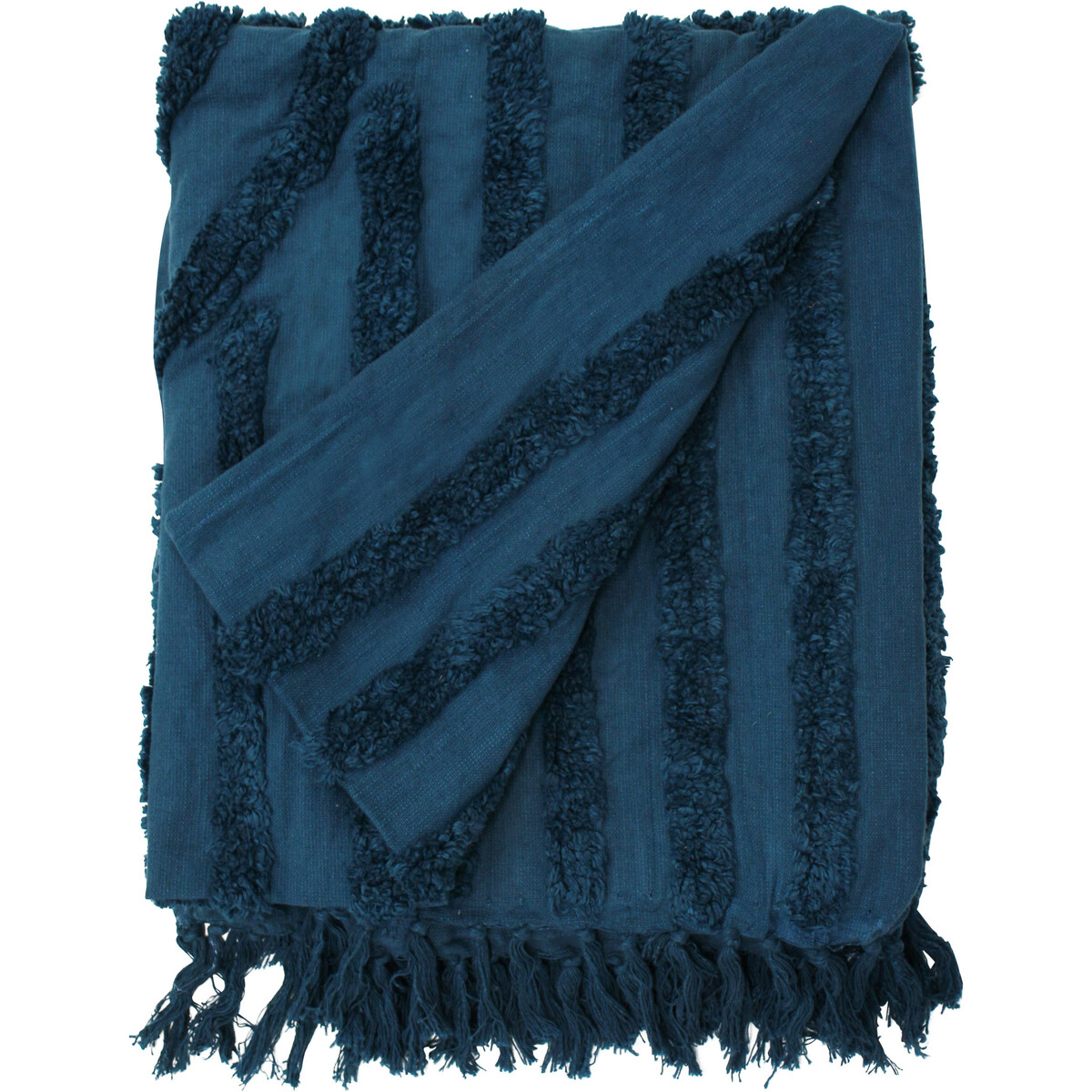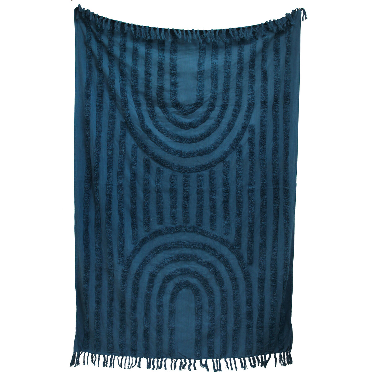 The fringed throw has a ribbed pattern and a gorgeous rich coloured indigo colour that lends a touch of relaxed kind of air to any space. Connecting as it does with your moments of rest and comfort, the cotton made texture of this throw is soft and its weight being quite light, it could be placed at the back of armchairs or simply thrown on the seat itself. It could be folded and placed in a basket next to the couch or placed on the foot of the bed-there are so many places where the presence of a throw is always welcome. Add that element of serenity, relaxation and comfort to your spaces and make them more welcoming. This piece is 160 cm in length and 130 cm in width, making it large enough for a super comfortable snuggle.