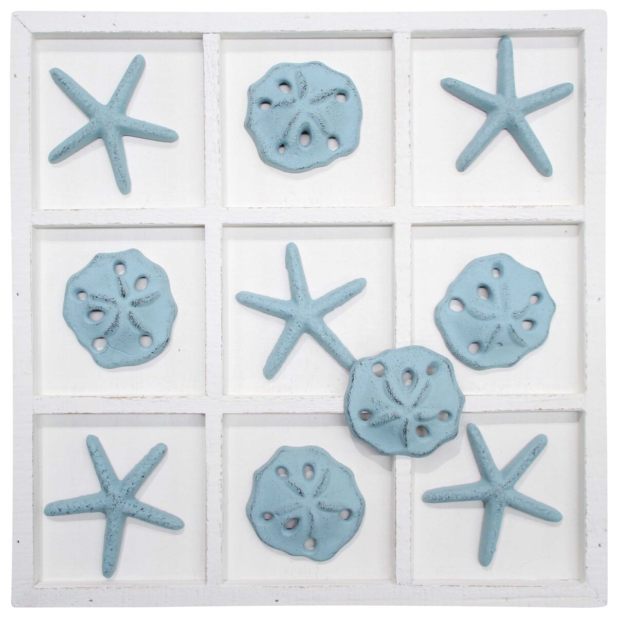Give whole new style check to your beach ready space with this tic tac toe board crafted from MDF and metal. While the board itself is made of MDF, the little shells and starfish are made of metal and painted in this powdery blue-as if they have been bleached to this soft blue hue because of the scorching sun. delightful in its unique take on beachy love. It's bound to look as fabulous on the wall as it would simply being placed atop a table. Square shaped with 36 cm dimension, it makes a pretty wall plaque with its white starkness and the pretty blue embellishments in the form of star fish. A fascinating little addition for those who like something more modern and whimsical in their spaces.